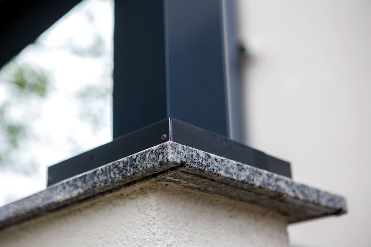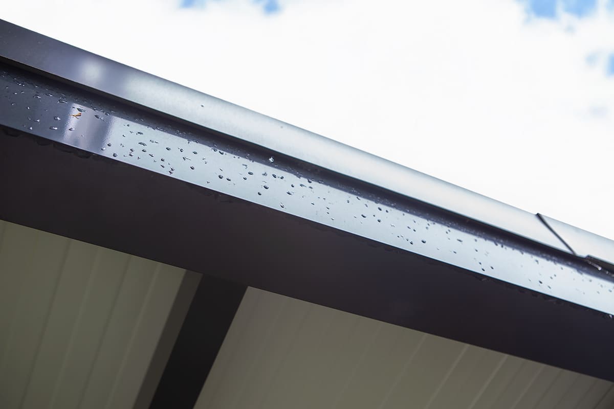Az alumínium kocsibeálló tetejét szendvicspanellel fedtük, amely kiváló választás kültéri szerkezetekhez. A szendvicspanel hatékony hangszigetelő, így az esőcseppek kopogása kevésbé hallható, ami különösen előnyös, ha a kocsibeálló a ház közelében helyezkedik el. A belső mennyezet natúr fehér színű, ami világosabbá és barátságosabbá teszi a teret. A tető enyhe dőlésszöge biztosítja, hogy a csapadék akadálytalanul lefolyjon, és egy antracit színű, négyzetes csatornarendszeren keresztül a környező növényekhez jusson. Ez a környezetbarát megoldás nemcsak praktikus, hanem hozzájárul a kert fenntarthatóságához is.