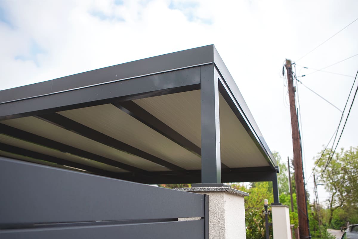 Az alumínium kocsibeálló vázát antracit színű, porszórt alumíniumból készítettük, amely számos előnnyel bír. Az alumínium könnyű, mégis rendkívül erős és strapabíró, így ideális választás kültéri szerkezetekhez. Rozsdamentes tulajdonsága miatt nem igényel különösebb karbantartást, és ellenáll az időjárási viszontagságoknak, például az esőnek vagy a nap UV-sugarainak. A porszórt felület sima, modern megjelenést kölcsönöz, amely tökéletesen illik a ház minimalista stílusához. A szerkezetet úgy terveztük, hogy a hátsó tartóoszlopokat betonalapba rögzítettük, míg az első kettőt a már meglévő kerítés tetejére rögzítettük, így a tartóoszlopok nem foglalnak el feleslegesen helyet a beállóból. Ez a megoldás nemcsak esztétikusabb, hanem a tér kihasználását is optimalizálja.