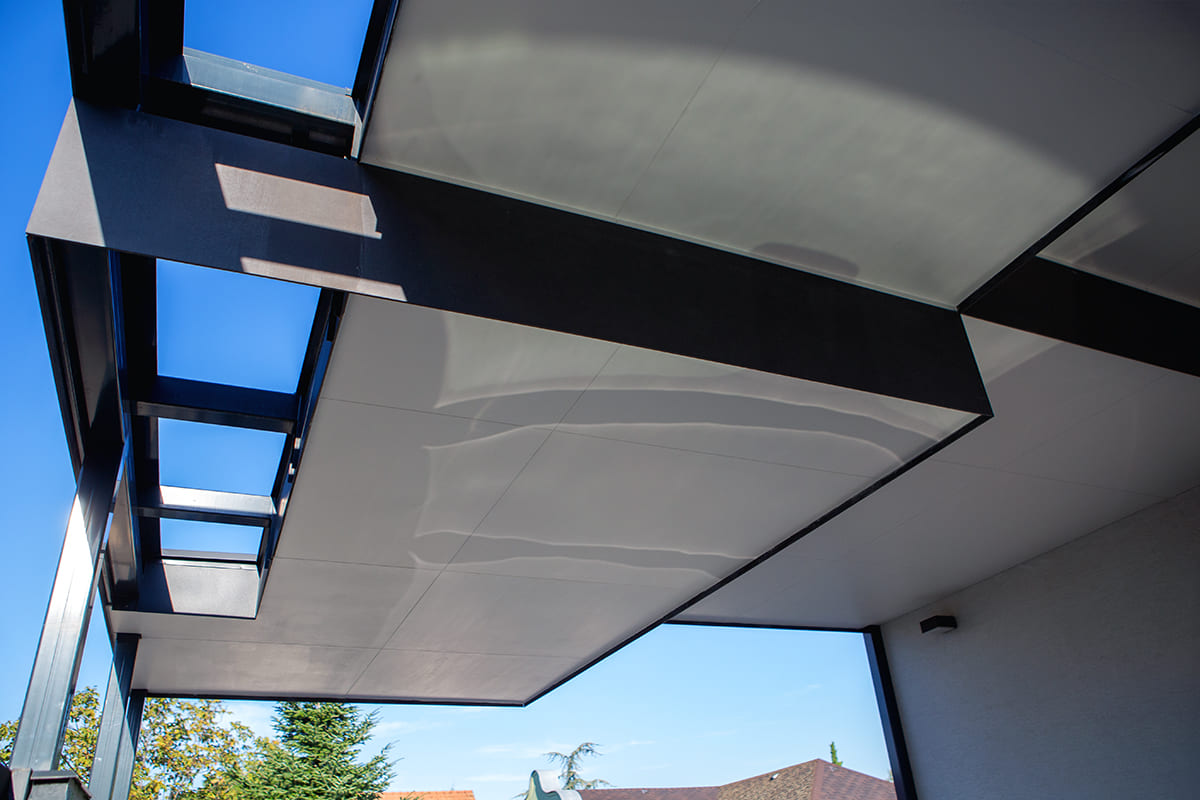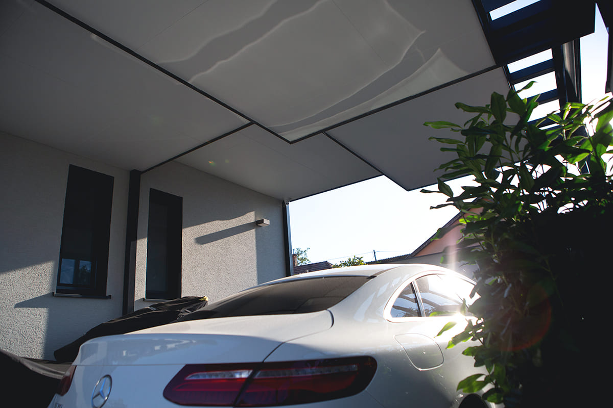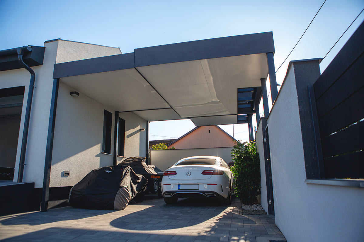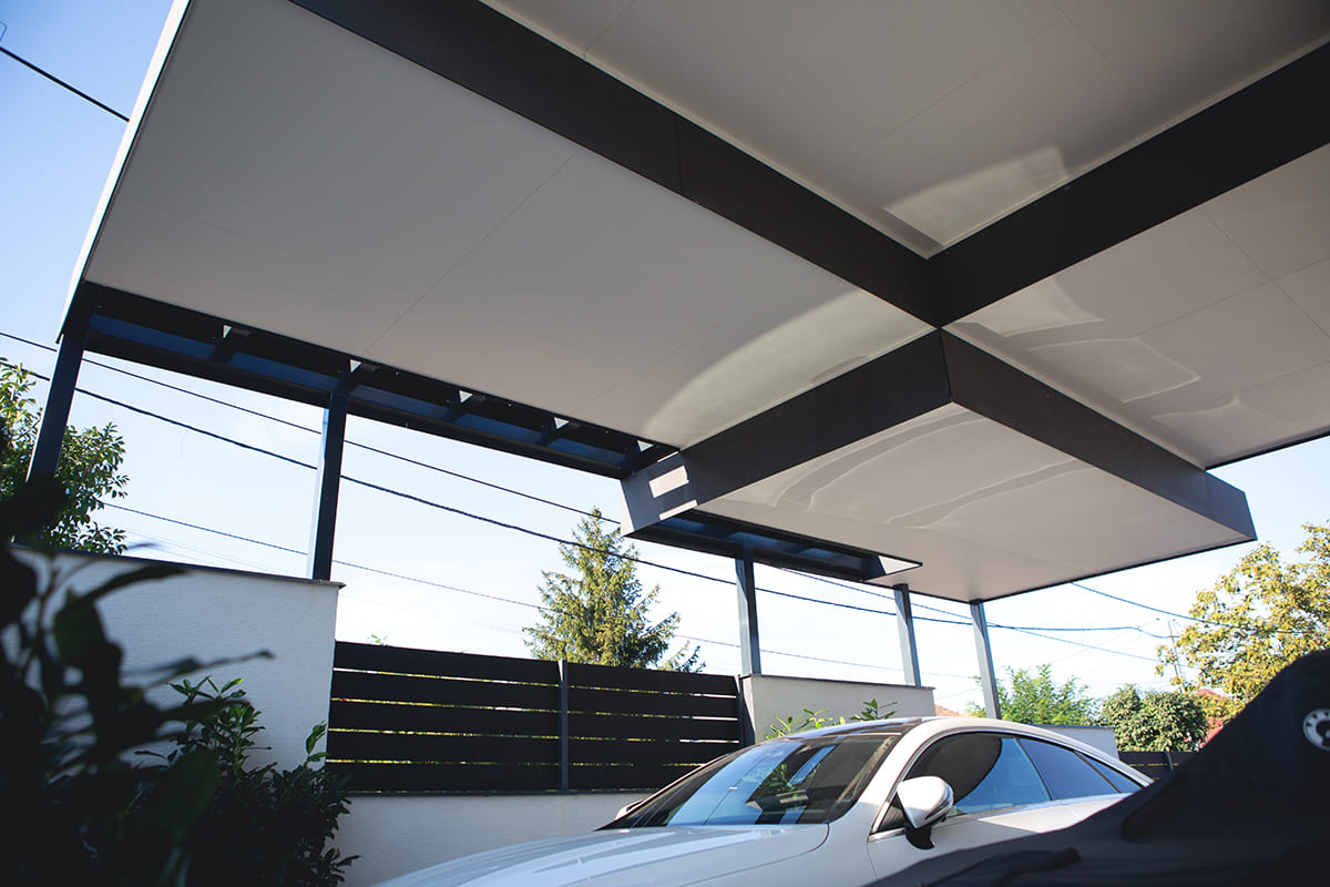 A négy különálló szinteltolásos tetőszerkezet kialakítása nagy kihívást jelentett a projekt során, de az eredmény minden várakozást felülmúlt. Az egyedi design elemekkel tervezett dupla kocsibeálló leglátványosabb része a tetőszerkezet, amely nemcsak vizuálisan vonzó, de rendkívül funkcionális is. A szintek eltolása lehetővé teszi a fény áramlását, így az alatta lévő terület világos és kellemes marad.
