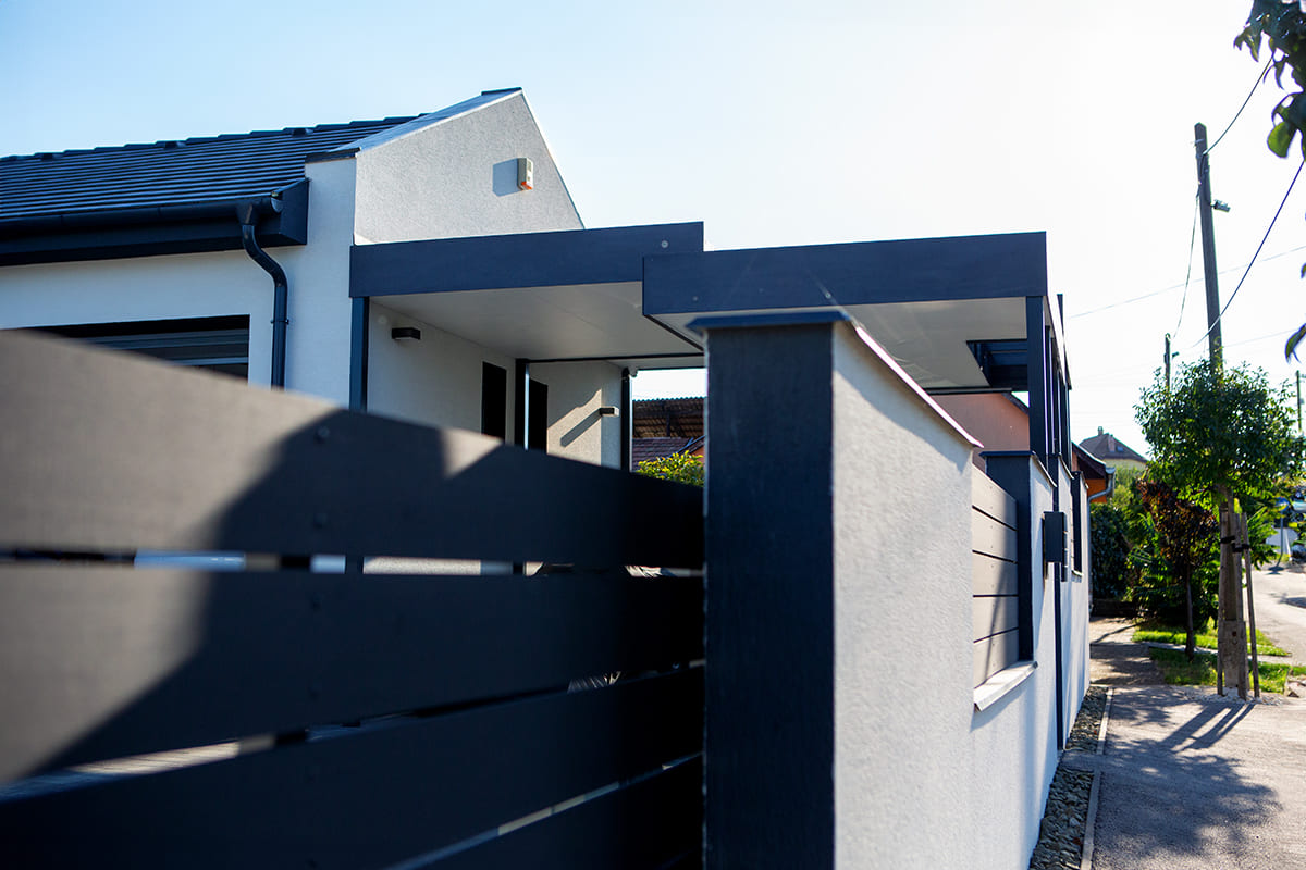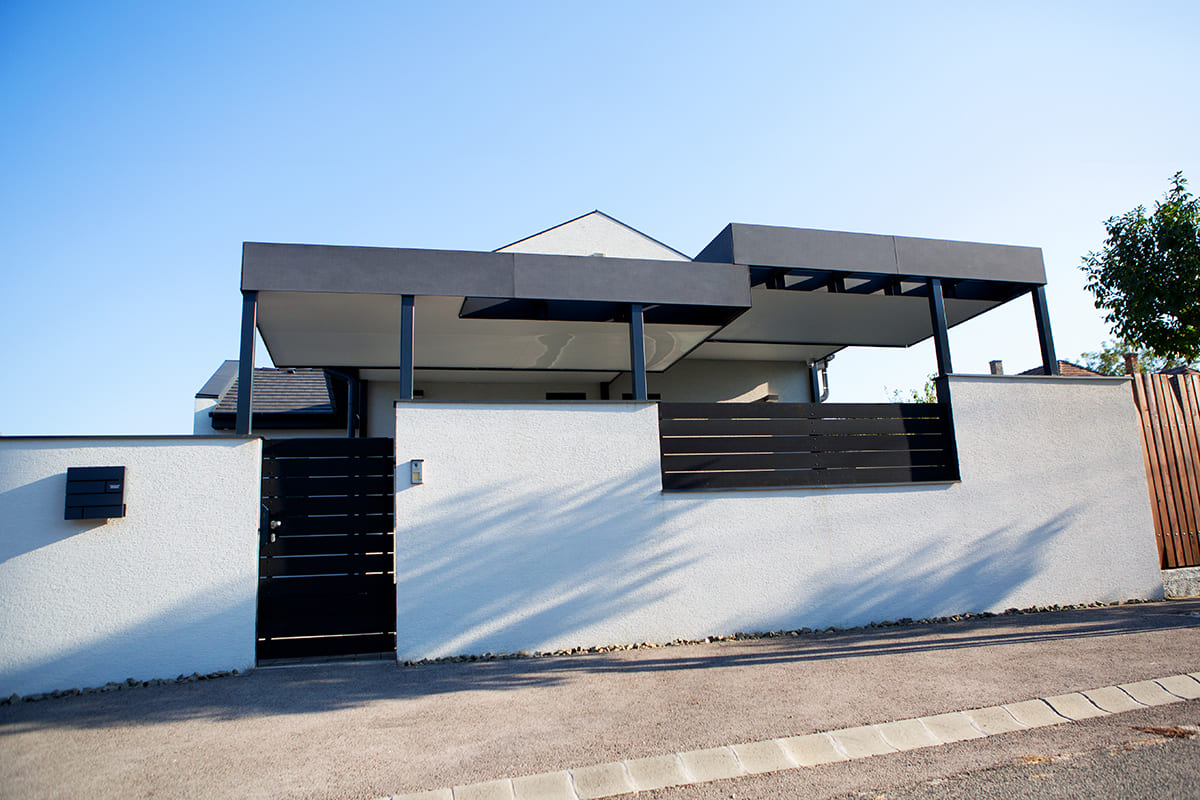 Egy ügyfelünk álmodott meg egy egyedi design elemekkel tervezett dupla kocsibeállót, amelyet mi terveztünk meg és építettünk fel. Ez a projekt lehetőséget adott arra, hogy eltérjünk a megszokott megoldásoktól, és új, kreatív módszereket alkalmazzunk. Az ügyfelünk elképzelései alapján a kocsibeálló tetője négy különböző részből áll, szinteltolással, a vízelvezetést pedig nem hagyományos csatornákon keresztül oldottuk meg, hanem a vizet a növények és kavicságy felé irányítottuk. Az építmény színei – fehér és antracit – tökéletesen harmonizálnak a ház színeivel, így az új kocsibeálló teljesen beleolvad a környezetébe, mintha mindig is része lett volna az ingatlannak.