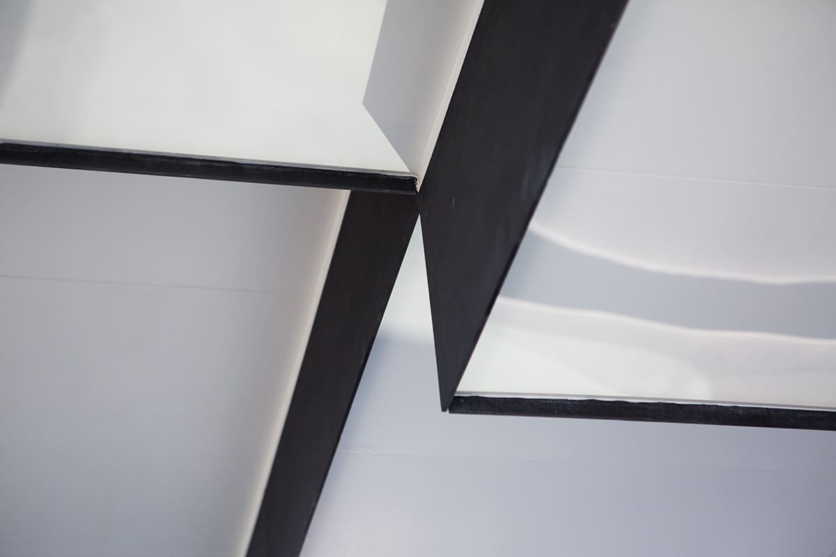 A tetőt kívülről Equitone homlokzati burkolattal láttuk el, amely antracit színű, tökéletesen illeszkedve a házhoz és a környező épületekhez. A vízszigetelés PVC anyaggal történt, ami biztosítja, hogy a tető hosszú távon is megőrizze minőségét. Az alsó mennyezet rétegelt falappal van burkolva, amely fehér színt kapott, így a tetőszerkezet belső része is letisztult, modern hatást kelt. A rejtett rögzítés miatt a tetőelemek találkozási pontjai alig észrevehetők, ezáltal az összkép esztétikailag is harmonikus marad.