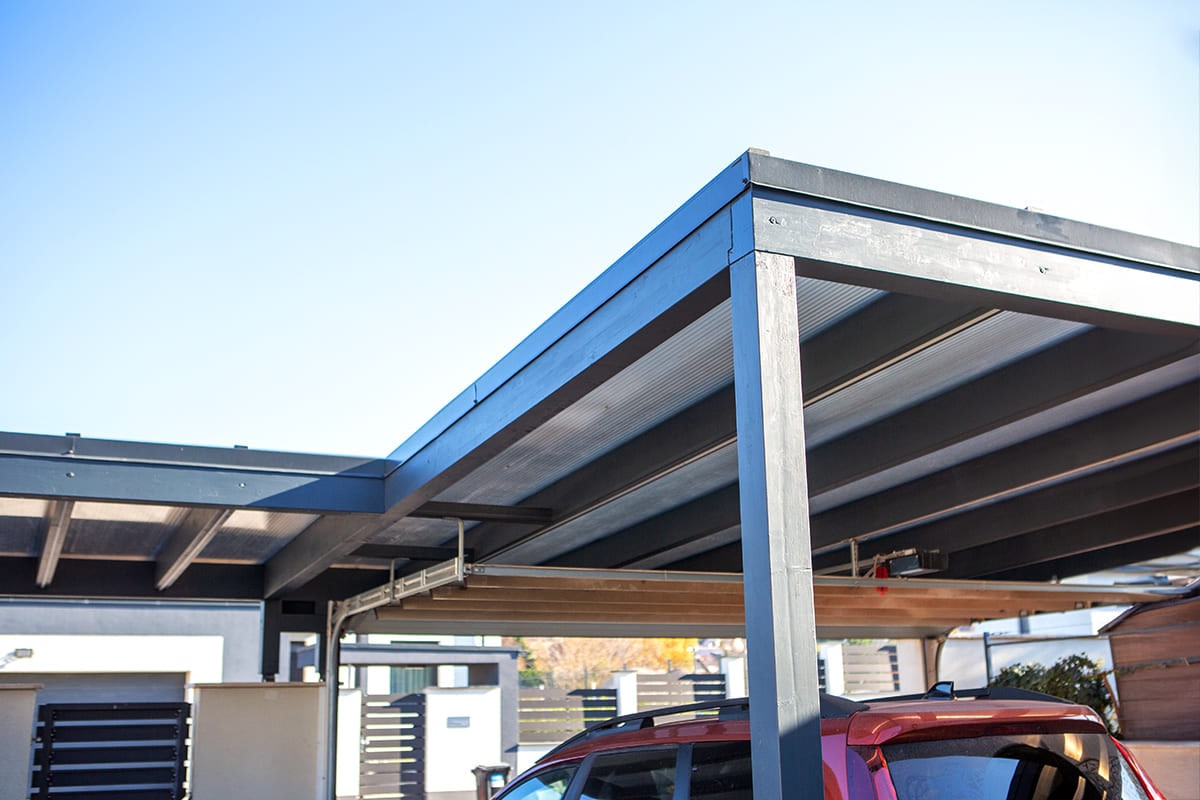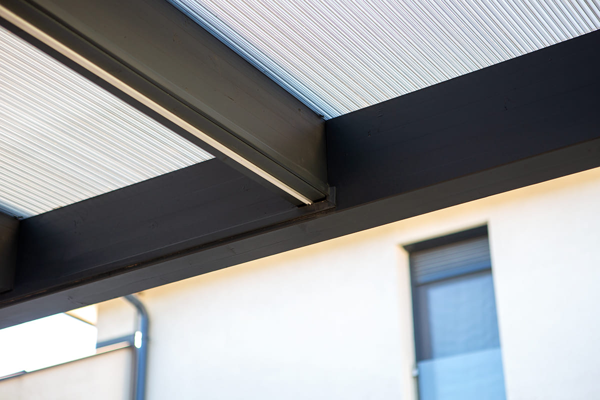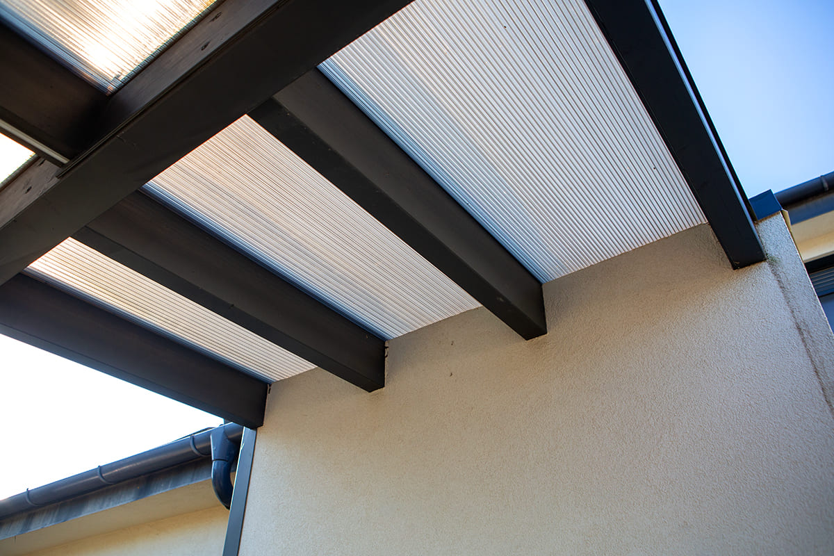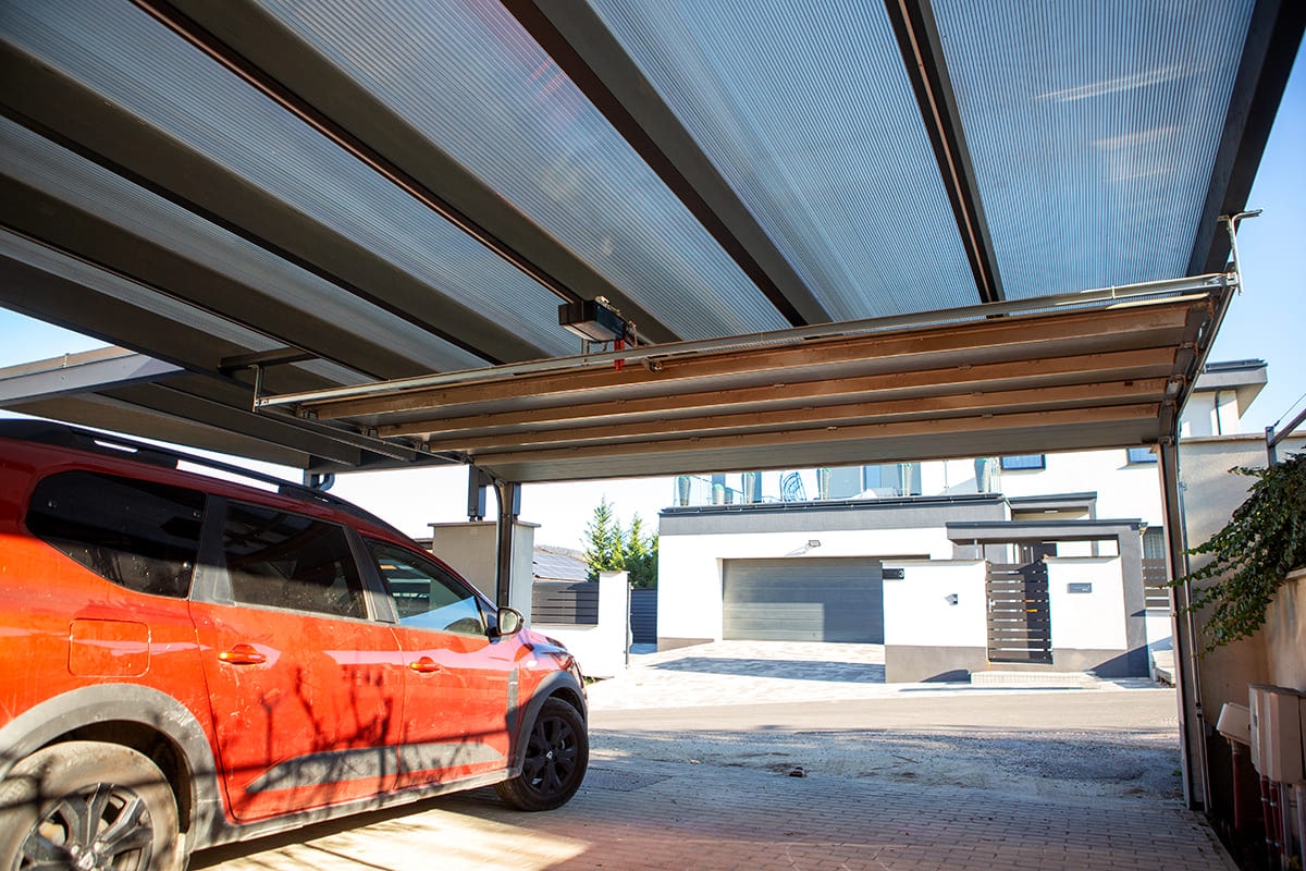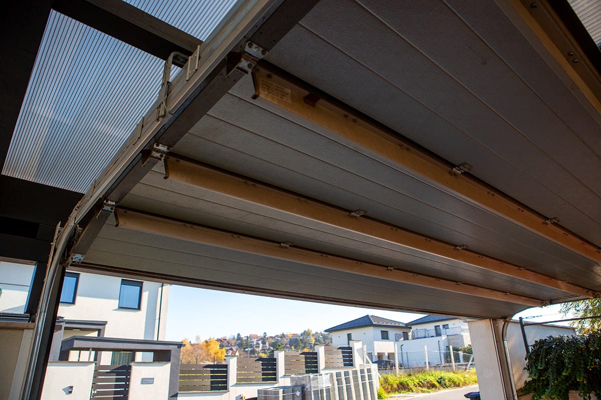 A beálló fedése egy rendkívül erős, ugyanakkor könnyű és rugalmas üregkamrás polikarbonát anyag, mely nagyobb felületű beállók fedésére is tökéletes. A polikarbonátnak továbbá az az egyik nagy előnye, hogy átereszti a fényt, így tágasabbá, világosabbá téve a teret, amit ügyfelünknek fontos szempont volt. A nagy fényáteresztő tulajdonság mellett viszont nem kell attól tartani, hogy az UV sugárzás vagy az infravörös sugárzás kárt tenne például a tető alatt parkoló autók fényezésében, ugyanis ez a polikarbonát anyag 100%-ban kivédi az UV sugarakat és akár 83%-ban az infravörös sugárzást is. Így a járművek nem csak a csapadék vagy akár a jégeső, hanem a nap káros sugaraival szemben is védve vannak.