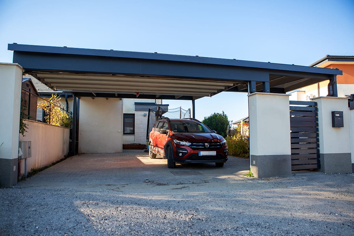 A dupla kocsibeálló elektromos garázskapuval megkívánja a masszív szerkezetet, hiszen ebben az esetben még egy távirányítós garázskapu szerkezetét is stabilan meg kell tartania minden fennakadás nélkül, hosszú évekig. Az építmény szerkezete erre a célra több alapanyagból is készülhet, mi az ügyféllel az erős, időtálló és esztétikus rétegragasztott fát választottuk. A rétegragasztott fa egy speciális vágási és ragasztási technológiának köszönhetően nem csavarodik el, nem reped meg az idő során, szemben például a hagyományos fagerendákkal. Sokkal jobban ellenáll a szélsőséges időjárási körülményeknek, így kifejezetten ideális választás kültéri építményekhez is, mint amilyen ez a dupla kocsibeálló elektromos garázskapuval. Strapabíró és természetes anyag, amit bizonyos időközönként érdemes ápoló festékkel vagy lazúrral átkenni, hogy még tovább megőrizhesse minőségét. Mi teljes fedésű Remmers festéket használtunk antracit színben, hogy a kocsibeálló igazán időtálló legyen és jól illeszkedjen a modern környezethez, ugyanis a ház alapszínei közé tartozik a fehér és az antracit, így ennek az igénynek is eleget tettünk.