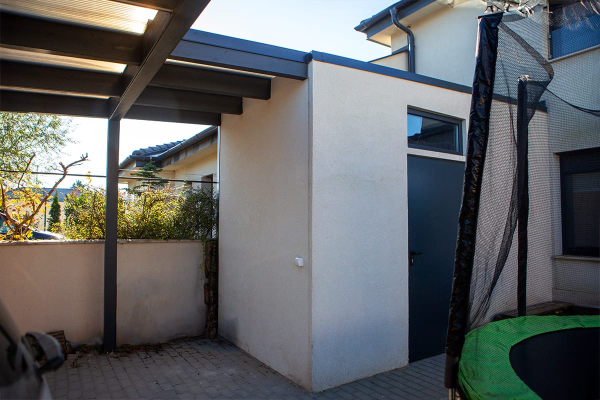 Ebben a projektben az ügyfél igényei alapján, a beállón kívül még építettünk egy kis melléképületet a ház oldalához, mely tárolóként funkcionál. Könnyűszerkezetes módszerrel készült, így a tároló szerkezete is rétegragasztott fa és minden oldalról zárt. A külső borítás a házzal megegyező fehér vakolást kapott és elölről ajtóval nyitható, mely szintén antracit színű. Az ajtó felett egy kis fakeretes - szintén antracit színű - ablakot alakítottunk ki, így beáramlik a természetes fény, világosabbá téve a teret.