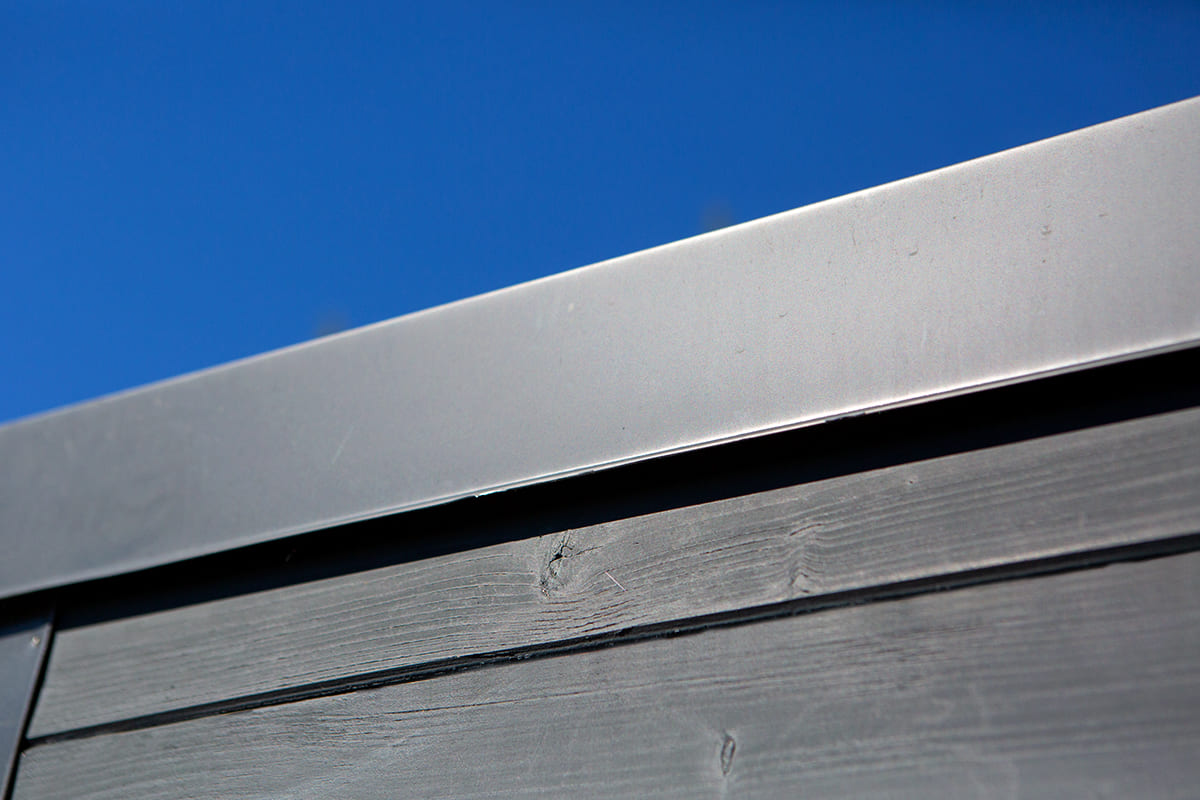 A kocsibeálló fedésére trapézlemezt használtunk, amely több rétegű gyári felületvédelemmel ellátott acéllemez. A trapézlemez alsó oldala gyárilag tört fehér színű, ami azonban itt nem látszik, mivel a mennyezetet fehér rétegelt falapokkal burkoltuk. Ez a megoldás nemcsak esztétikus, hanem a szigetelést is javítja, valamint egységes, letisztult megjelenést kölcsönöz az építménynek.