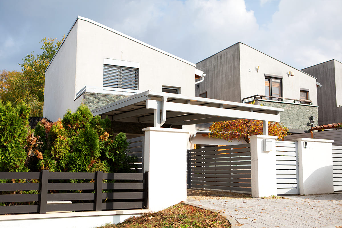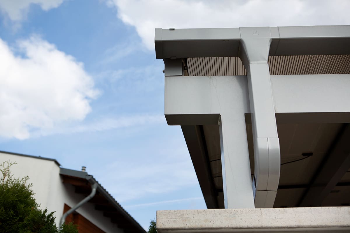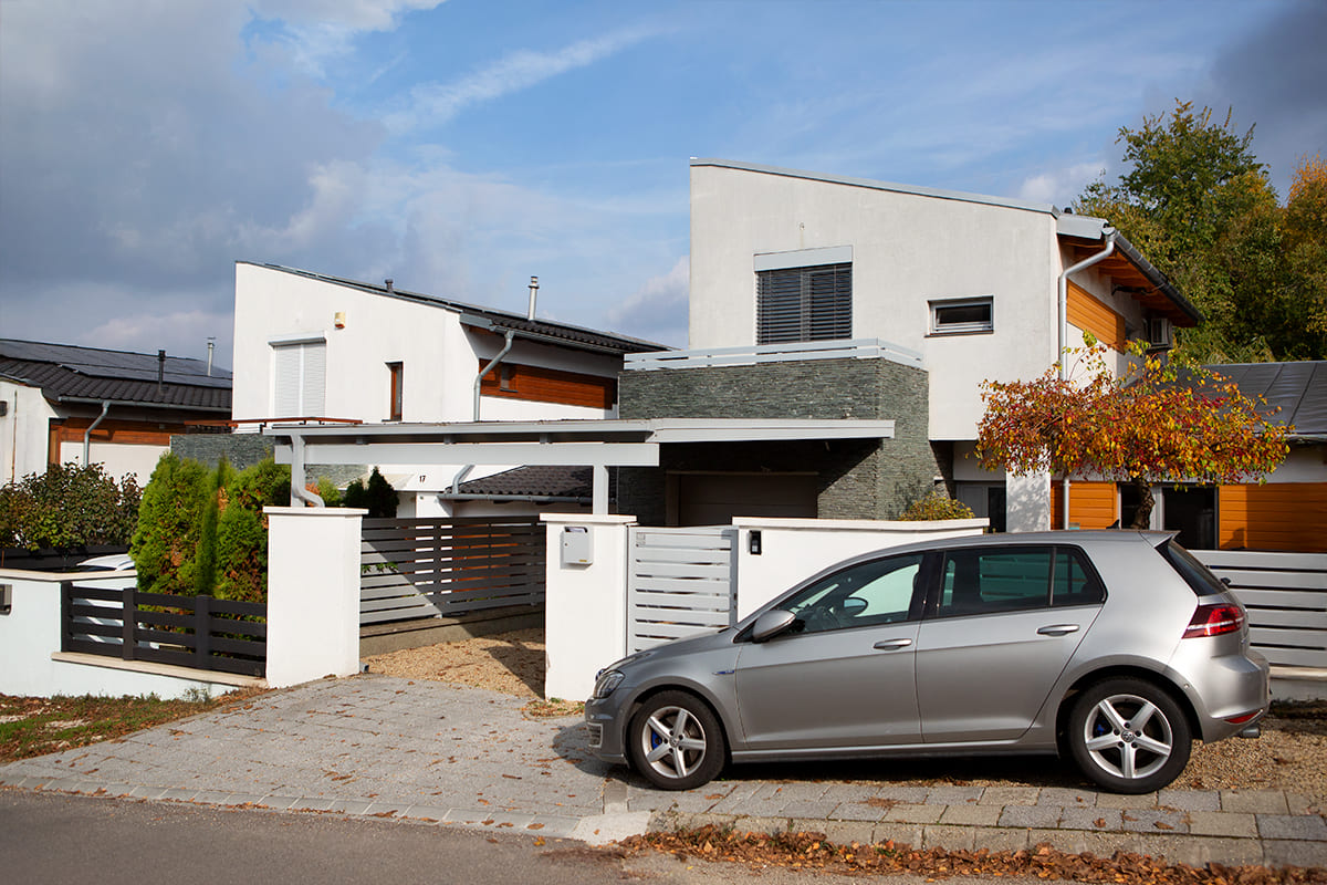 A felületkezelés bármilyen RAL skálán szereplő színben kivitelezhető, így rugalmasságot és szabadságot adva, bármilyen épülethez jól illeszthető. A porszórás nem csak szép színt, hanem extra védelmet is biztosít az anyagnak. Jelen projektünkben ügyfelünk ezt a világosszürkét választotta a napelemes alumínium kocsibeálló vázához, mivel a már meglévő kerítése (és a ház ablakainak kiegészítői, valamint az erkély korlátja) is pontosan ilyen színű, így teljes az összhang. A kerítés tartóoszlopai fehér színűek, ahogyan maga a ház is. A fehér ezzel a világosszürkével igazán fiatalos és barátságos benyomást kelt.