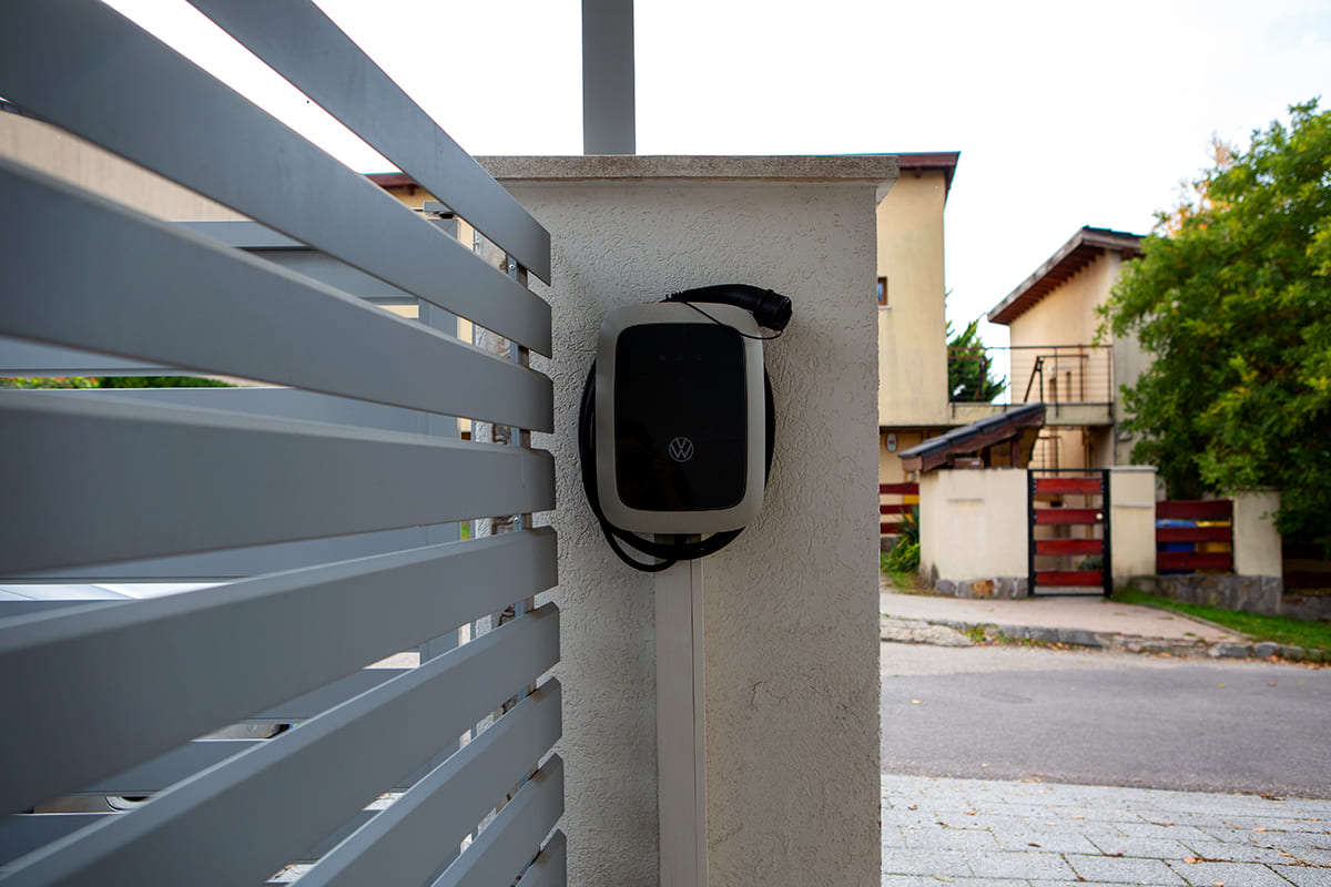 A napelemes alumínium kocsibeálló bejáratánál még egy falra szerelt elektromos autótöltő is található, így könnyen és gyorsan feltöltheti a tulajdonos az elektromos autóját anélkül, hogy a zárt garázsba be kellene állnia. Ez a típusú töltő elegendő helyet biztosít a töltőkábel számára, amit könnyedén a töltő köré lehet tekerni, így nincs útban a kábel.