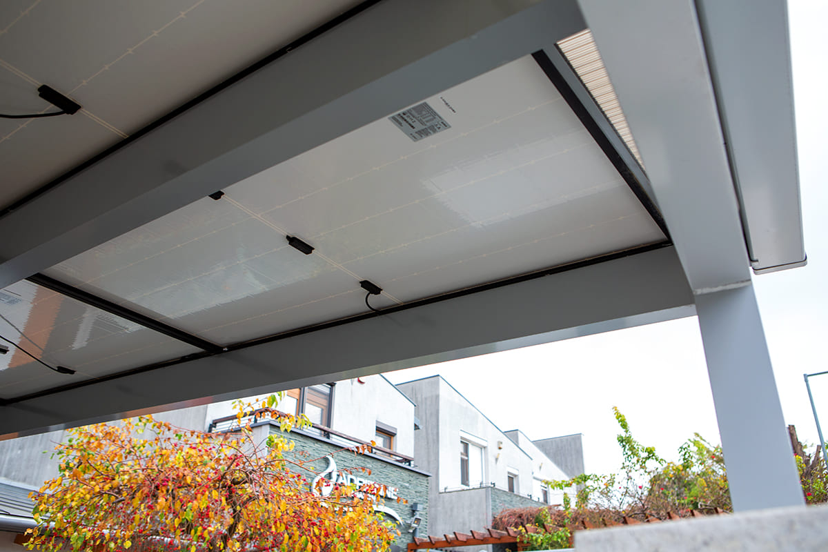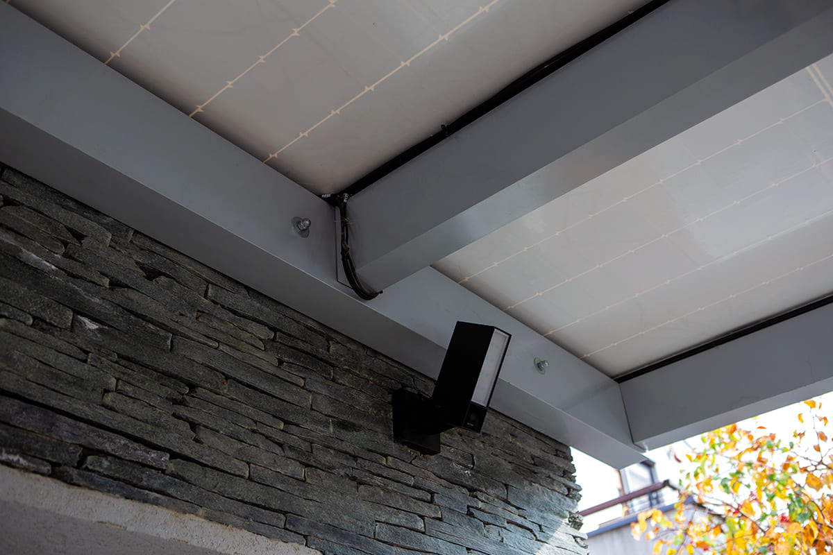 A napelemek alja fehér színű, ami világosabbá, tágasabbá teszi a teret. A hely mérete limitálta a panelek számát, és mivel ügyfelünk a beálló teljes területét le szerette volna fedni, így azokat a területeket, ahova már nem fért a napelem panelből, füst színű hullámos polikarbonáttal egészítettük ki.