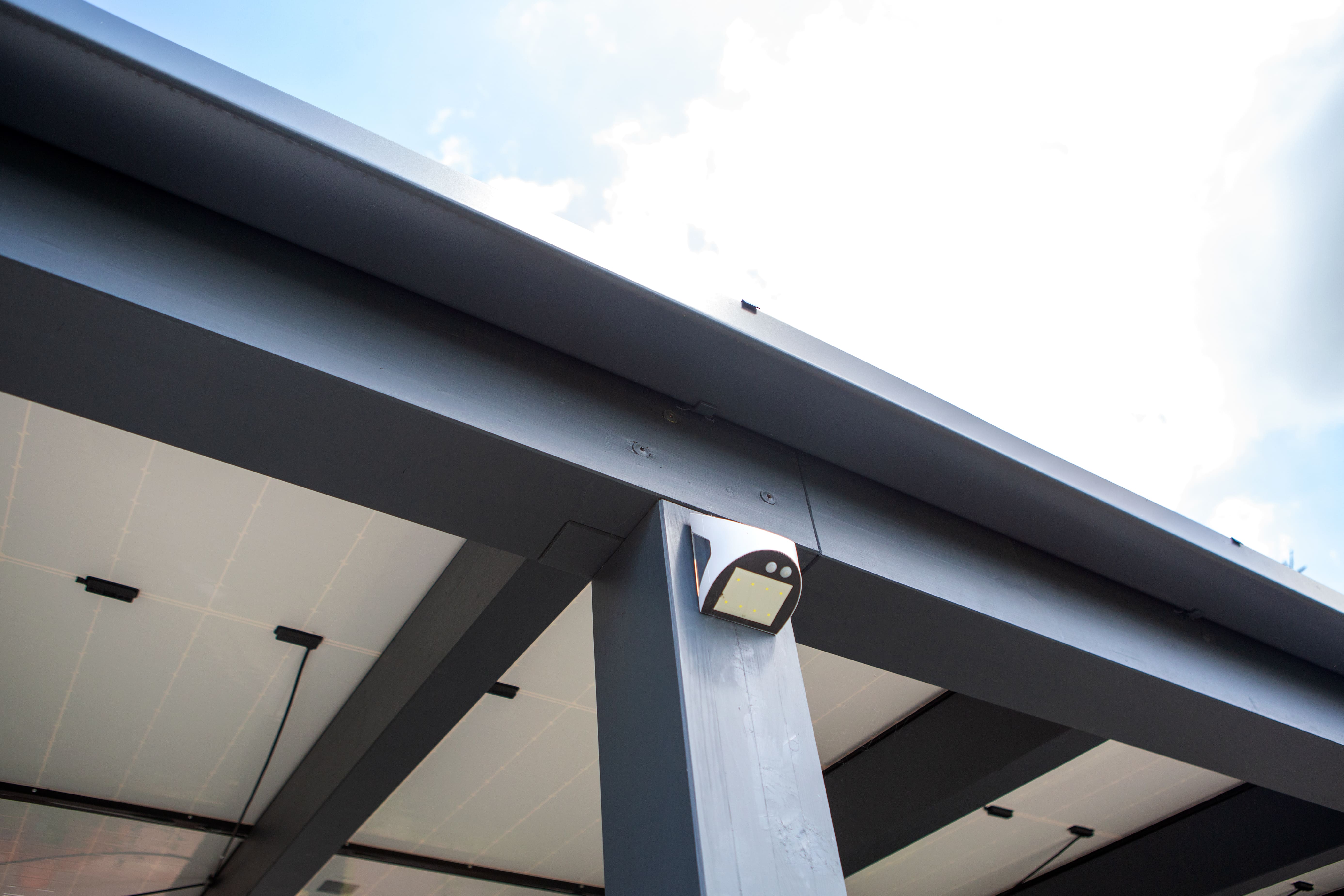 Az ügyfél kifejezett igénye volt, hogy a kocsibeálló fedése a lehető legnagyobb mértékben hasznosuljon energiatermelésre. Ennek megfelelően a négy beállásos kocsibeálló tetőfedésének legnagyobb részét napelem panelekkel láttuk el. Ezek a panelek nemcsak a ház energiaellátását támogatják, hanem egyben a szerkezet vízzáró tetőfedését is ellátják. Az alkalmazott egyedi illesztési technikának köszönhetően a napelem panelek teljes mértékben szivárgásmentesek, így nincs szükség további kiegészítő fedésre vagy burkolatra. A panelek alsó felülete fehér színű, amely a fényt visszaveri, ezáltal nem sötétíti el a kocsibeálló alatti területet, megőrizve a világos, tágas érzetet.