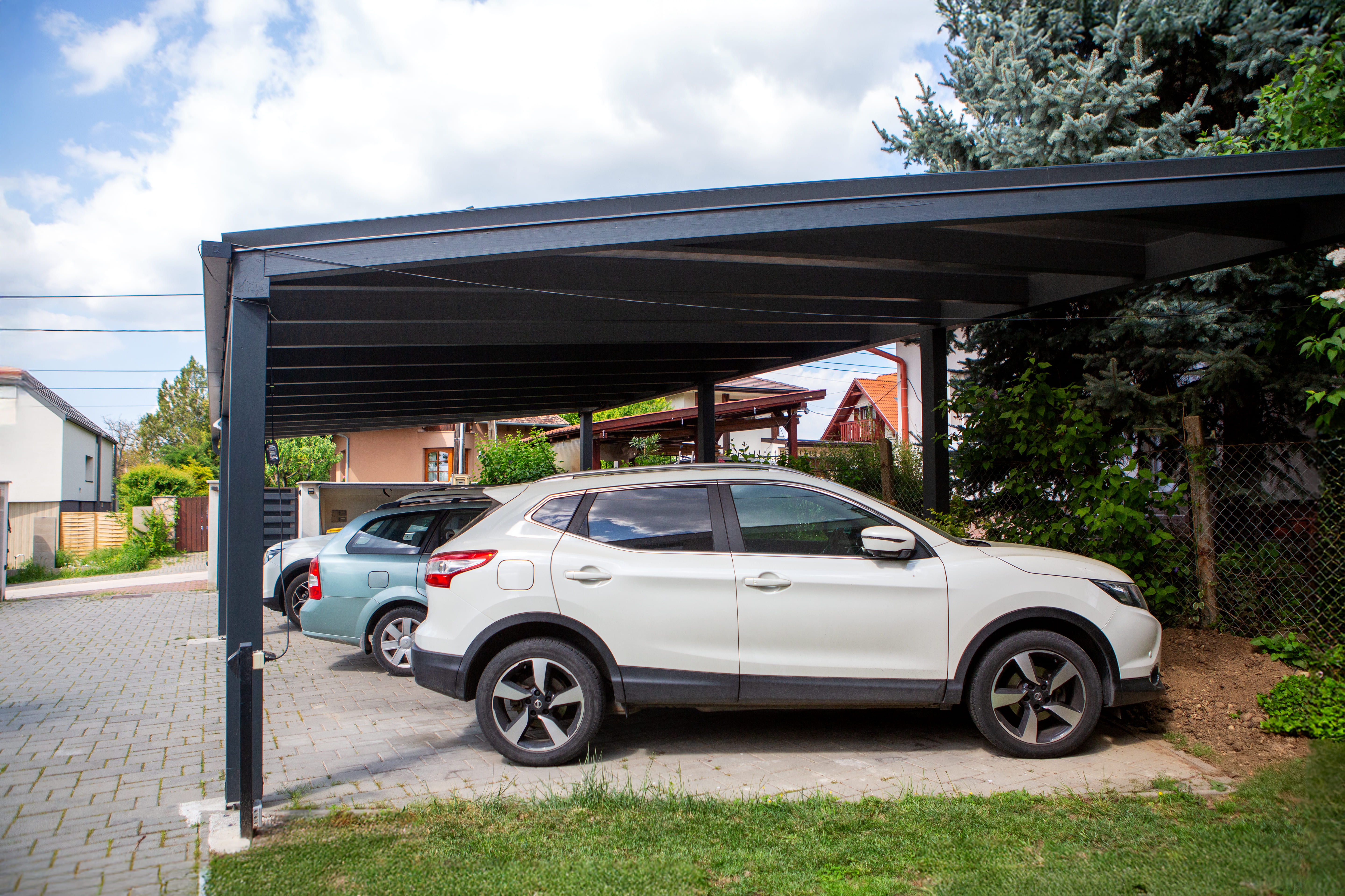 A csapadékvíz hatékony elvezetése minden kocsibeálló esetében alapvető szempont. Ennél a projektnél a szerkezethez színben és vonalvezetésben is illeszkedő, antracit színű, négyzetes csatornarendszert építettünk be. Ez a rendszer megbízhatóan vezeti el a tetőre hulló esővizet, így megakadályozza a szerkezeti elemek átnedvesedését és a beázást. A csatornák és lefolyók elhelyezése a beálló statikai és vizuális szempontjaihoz igazodik, így a vízelvezetés sem zavarja a mindennapi használatot, és hozzájárul a szerkezet hosszabb élettartamához.
