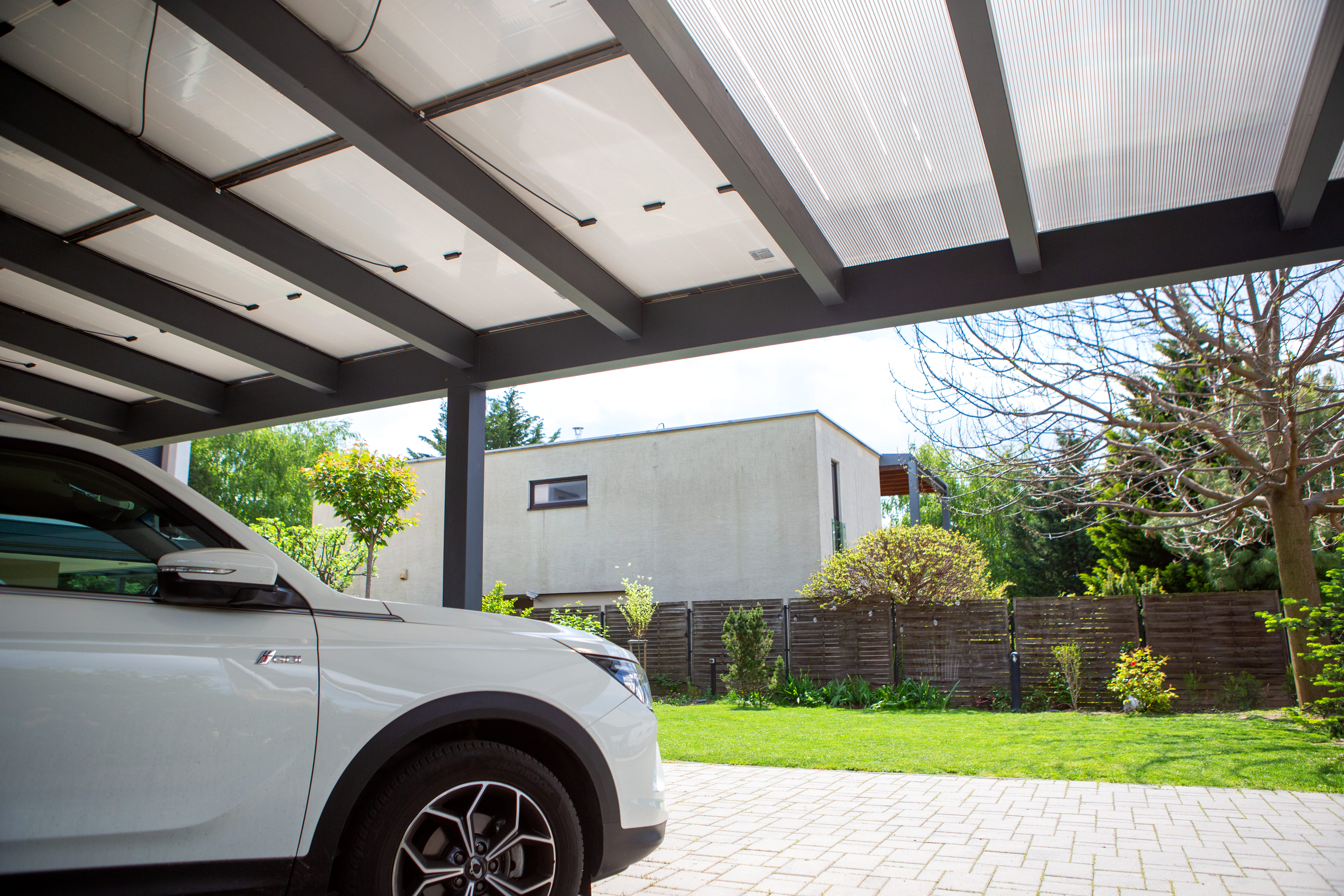 A kocsibeálló fennmaradó, napelemmel nem fedett részén fényáteresztő polikarbonát paneleket alkalmaztunk. A polikarbonát egyik fő előnye, hogy rendkívül alacsony karbantartási igényű, ugyanakkor erős, időjárásálló anyag, amely a fényt átengedi, így az autók fölötti tér világosabb, barátságosabb marad. A panelek 100%-ban kiszűrik a káros UV-sugárzást, ezzel megakadályozzák az autók fényezésének és belső tereinek károsodását. A fényáteresztő fedésnek köszönhetően a zárt érzet helyett egy világos, jól használható tér jött létre.