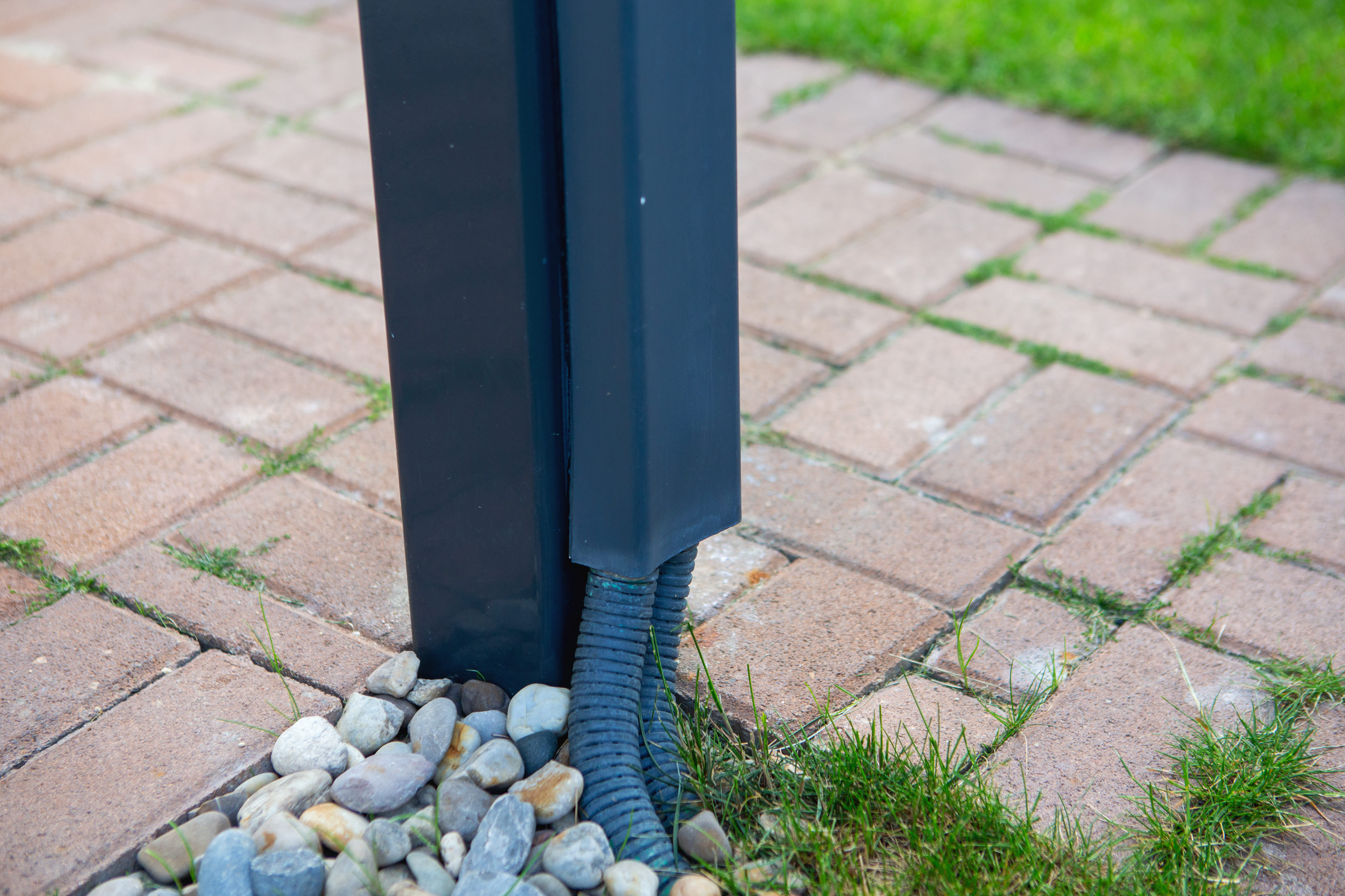 A szerkezet egyedisége, hogy az utca felé eső két tartólábat a már meglévő kerítés tartóoszlopaira rögzítettük, így a beálló lábai nem foglalnak el feleslegesen további helyet a térből. A hátsó tartóoszlopokat betonalapba rögzítettük, amely biztosítja a teljes szerkezet szilárdságát.