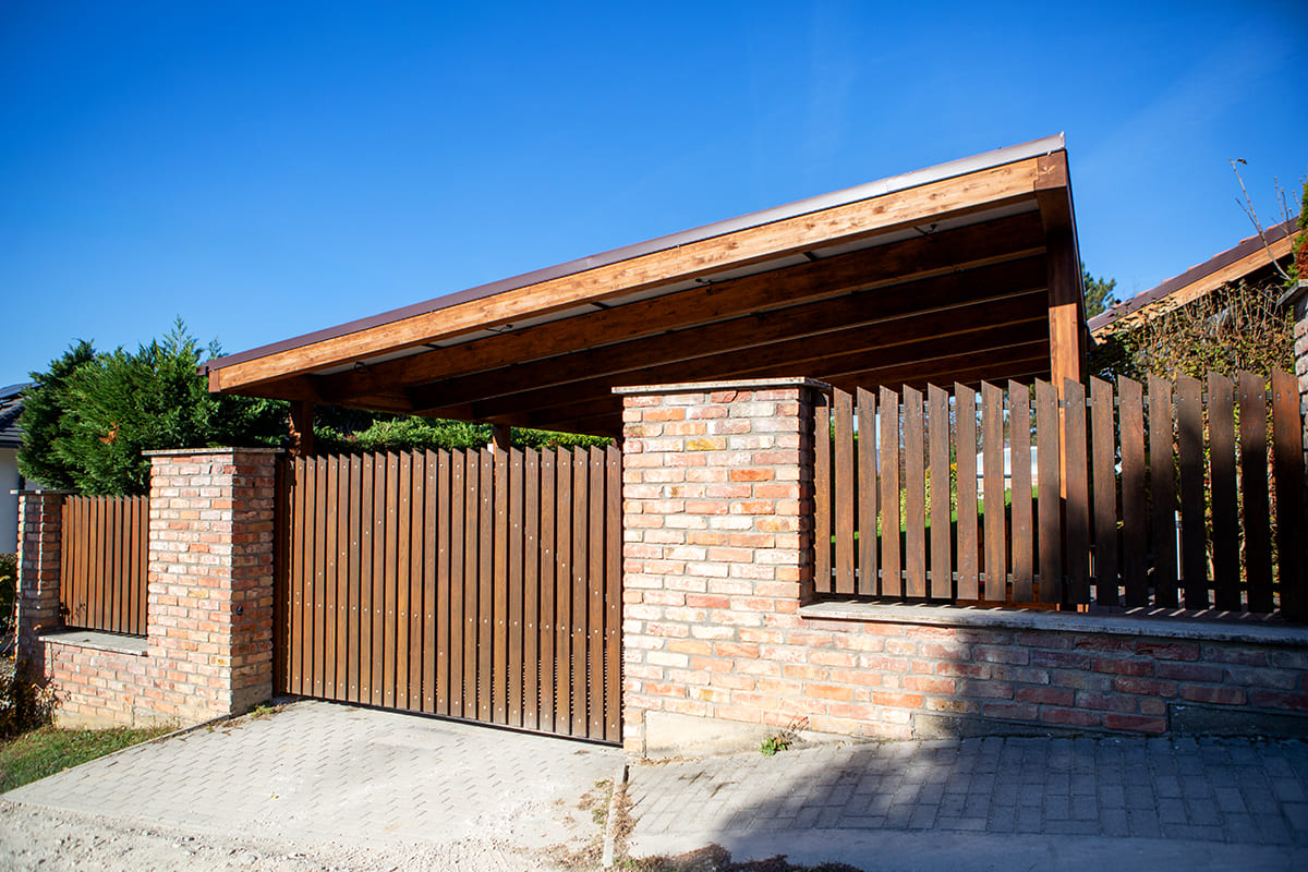 A családi ház tégla és fa anyagaihoz igazodva a kocsibeálló szerkezetét is úgy alakítottuk ki, hogy az organikusan beleolvadjon a környezetbe. A ragasztott fa alapanyagból készült szerkezetet lazúrral kezeltük, hogy a természetes erezet látható maradjon, ugyanakkor az időjárásnak is ellenálljon. A tervezési folyamat során külön hangsúlyt fektettünk arra, hogy a beálló a házzal összekötő lépcsősor fölé is kiterjeszthető legyen. Ennek köszönhetően a kocsibeálló nemcsak a járművek védelmét szolgálja, hanem az eső, hó vagy napsütés elleni védelem érdekében a ház megközelítését is kényelmesebbé teszi.