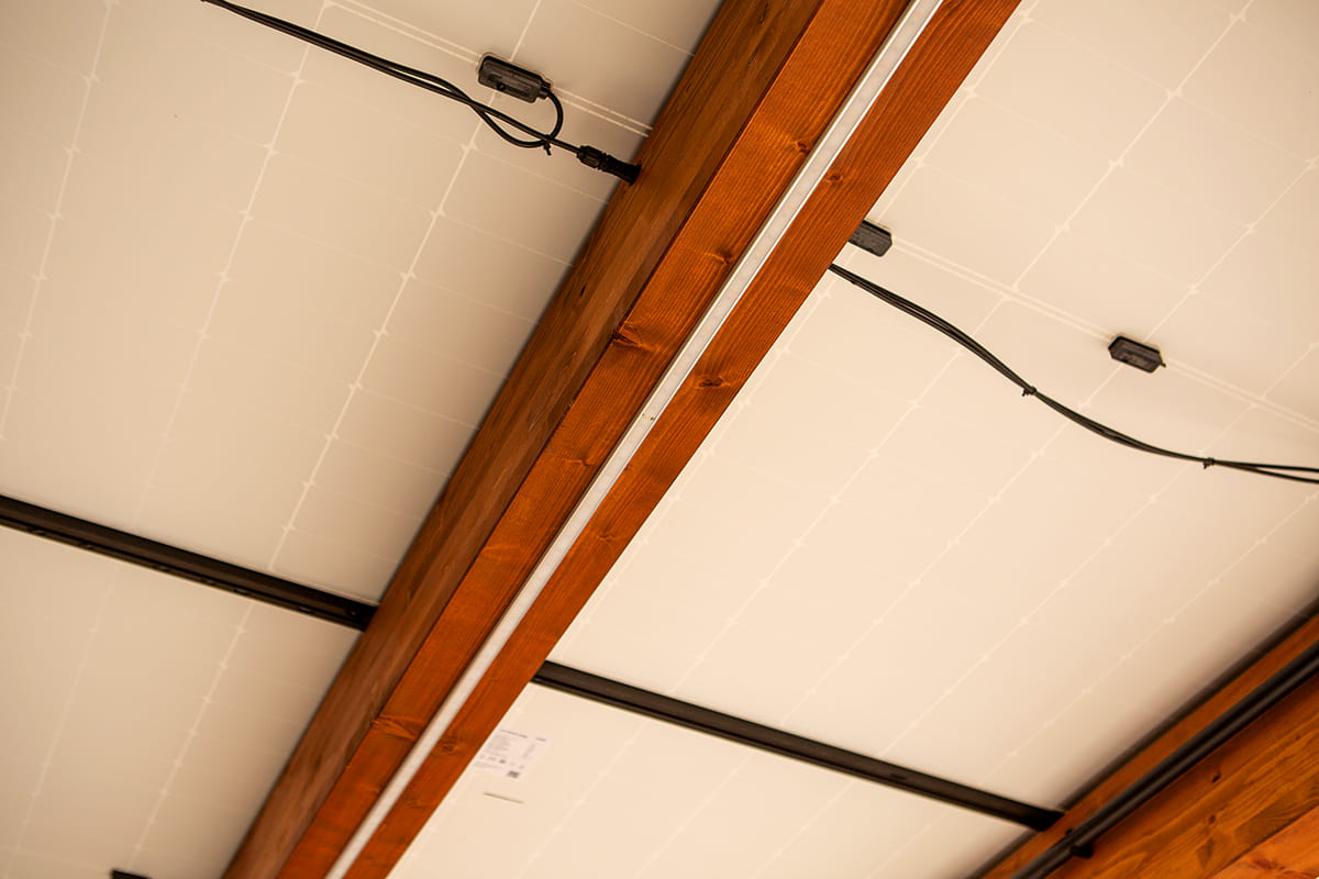 A napelemek elhelyezésénél figyelembe vettük a nap járását, hogy azok a lehető legtöbb napenergiát gyűjtsék be. A tetőszerkezet lejtése ennek megfelelően lett kialakítva, amely egyben az esővíz elvezetését is elősegíti. Az így megtermelt energia nemcsak környezetbarát módon csökkenti a háztartás energiafelhasználását, hanem az elektromos autó töltésére is felhasználható.