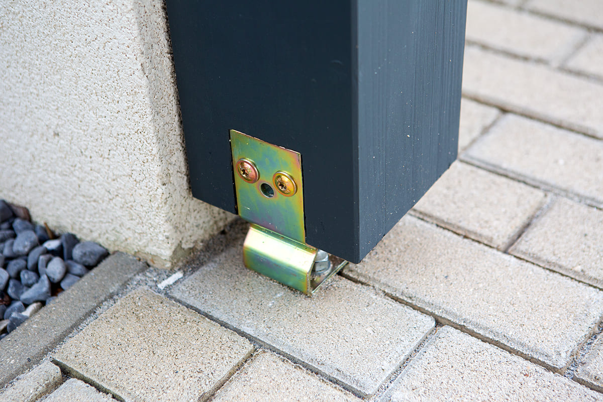 A szerkezet hátsó oldalát, tartólábak nélkül, a ház falához rögzítettük, míg elől két erős tartóláb biztosítja a stabilitást. A tartólábakat betonalapba rögzítettük, amit mi ástunk és öntöttünk ki a helyszínen a szendvicspanel fedésű kocsibeálló telepítése előtt. Ez biztos fixálást ad a kocsibeálló tartóoszlopainak, ezáltal az egész szerkezetnek. A kiöntött betonalapra visszahelyeztük az előzőleg eltávolított termésköveket, így a rögzítés helye nem is látszik, az eredmény egységes és letisztult lett.