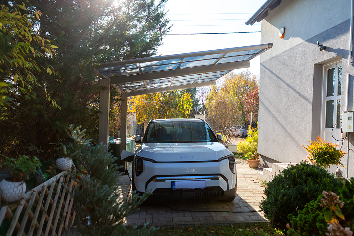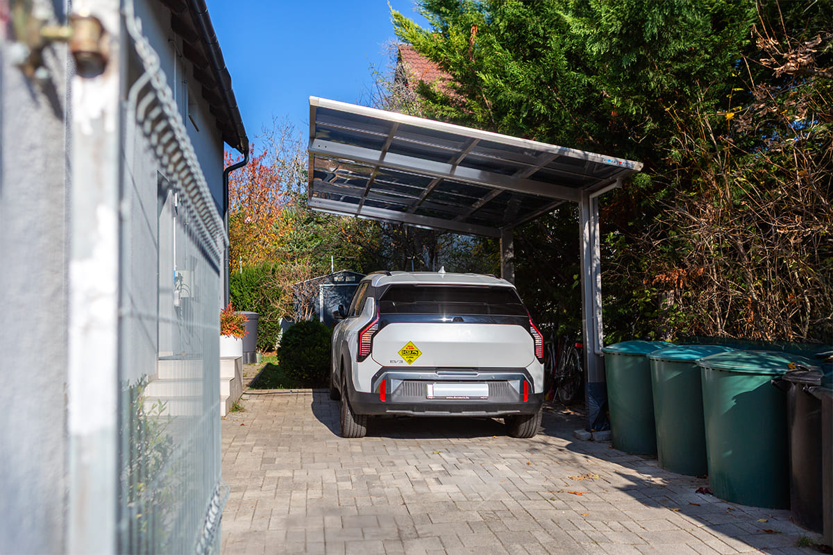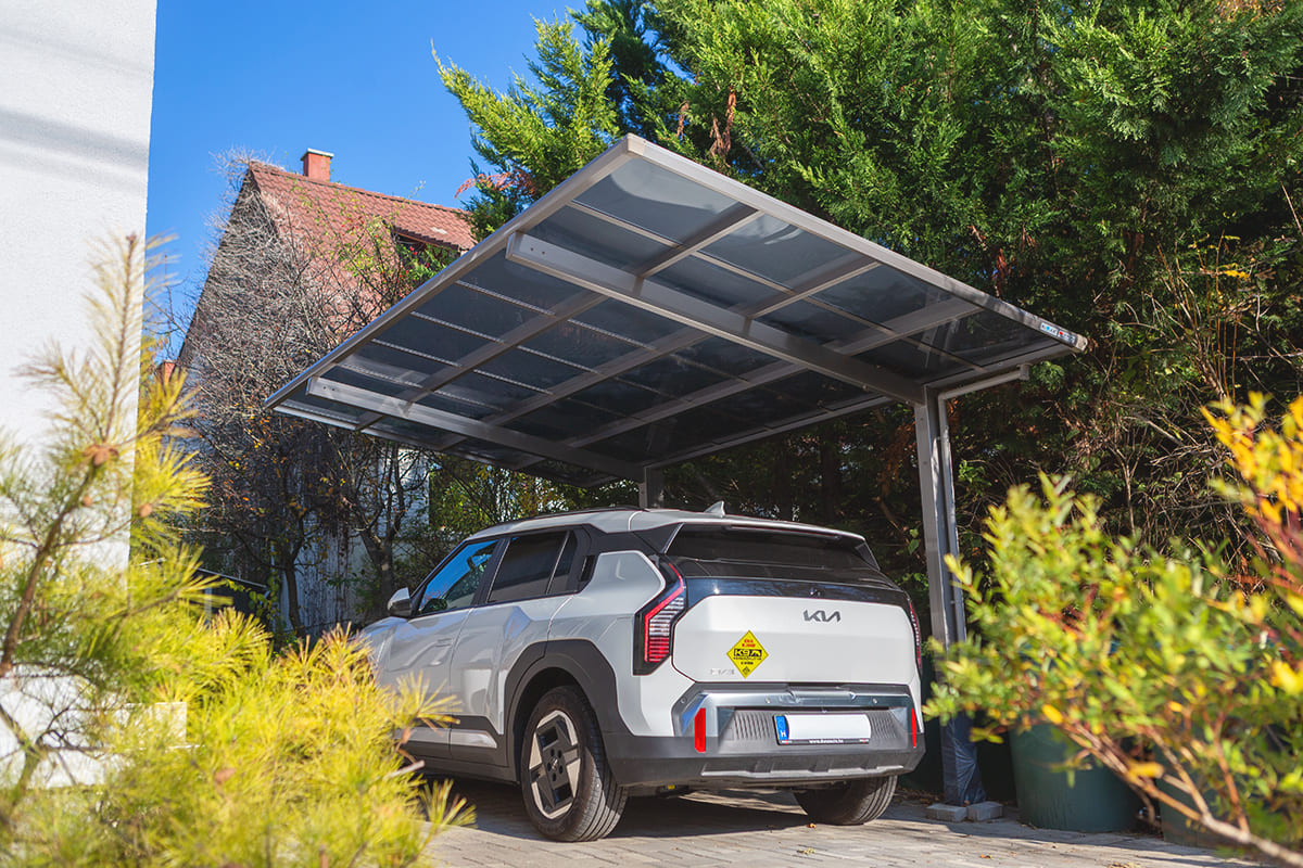 A füstszínű polikarbonát tető harmonizál a rozsdamentes acél színű alumínium vázszerkezettel, létrehozva egy egységes, professzionális megjelenést, amely évtizedeken keresztül megőrzi esztétikus karakterét. A polikarbonát tető további előnye, az esztétikai értékeken túl, hogy megbízható védelmet biztosít, ugyanis 100%-ban kiszűri a káros UV-sugarakat, részben átereszti a fényt, miközben elegendő árnyékolást biztosít. A polikarbonát tető könnyű, ám rendkívül erős anyag, ami nem csak az UV-sugárzástól és a csapadéktól védi az alatta parkoló járművet, hanem megbízható védelmet biztosít a lehullott ágakkal szemben is, ami jelen esetben azért hasznos, mert a beálló környékén sok fa található.