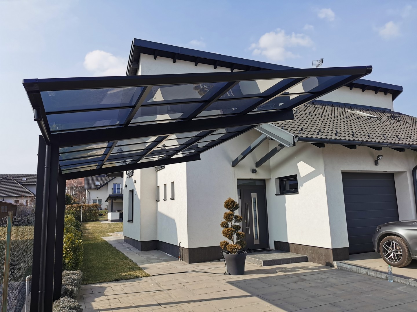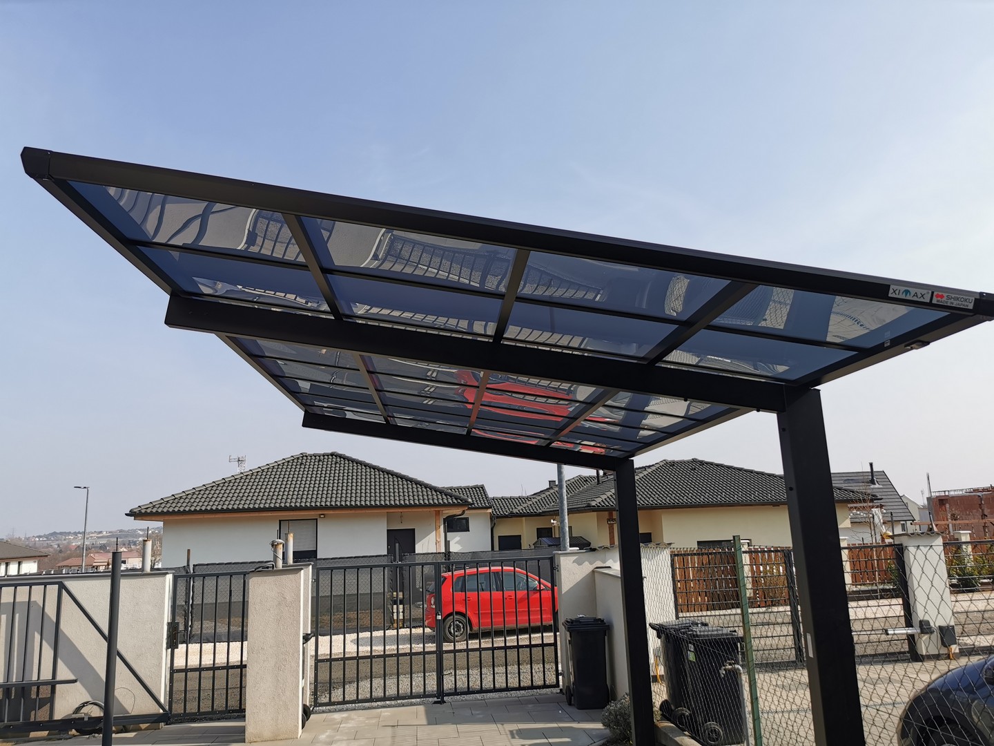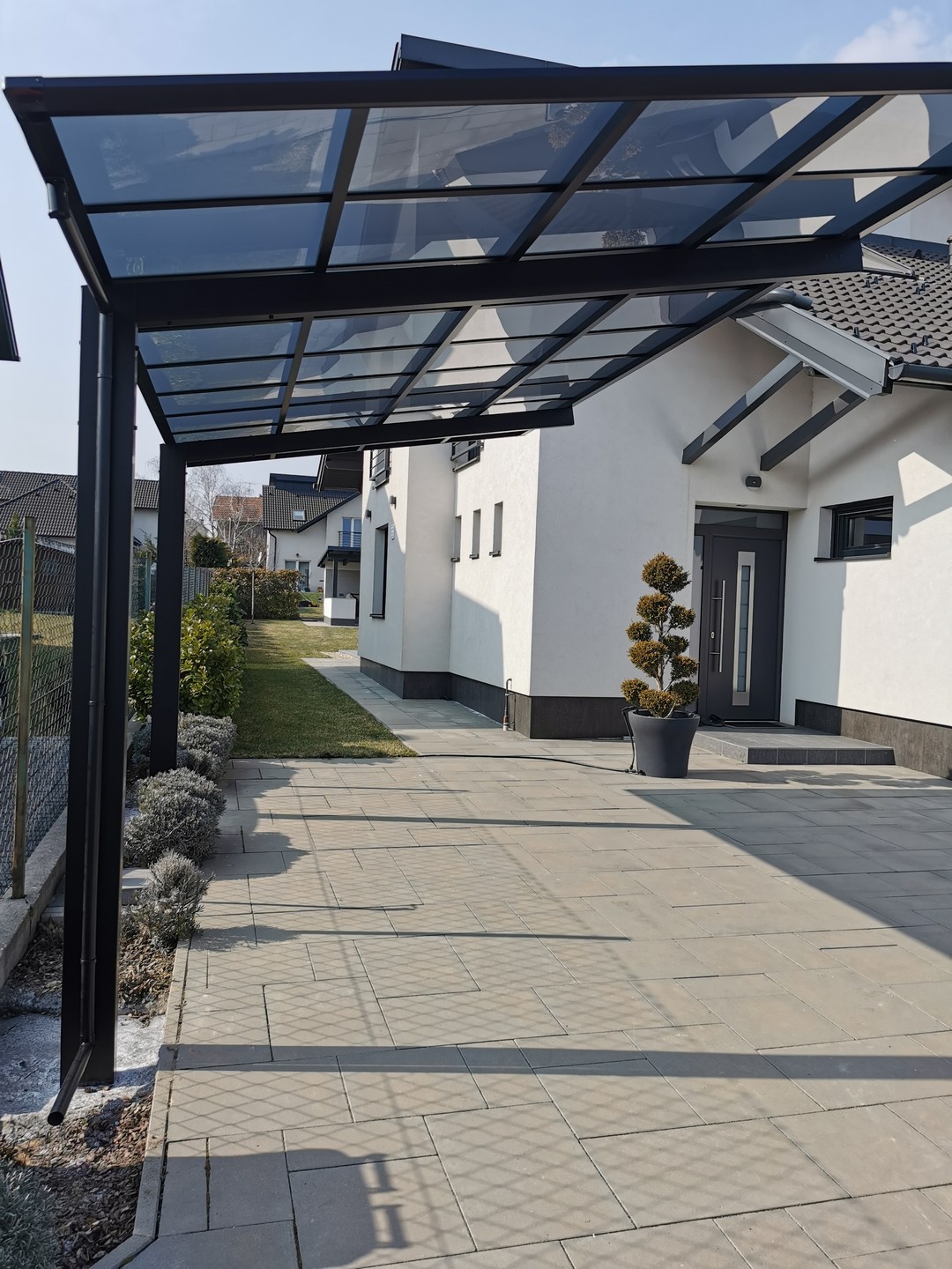 A képeken látható beálló extra hosszú kivitelű: a szokásos 495cm méret helyett, 555cm-es hosszal rendelkezik és így kényelmesen elfér alatta egy méretesebb autó is. Ezenkívül, a szerkezet fekete színe harmonizál a környezet részleteivel, a ház homlokzat és tető színeivel, vagy a kerítés antracit festésével.