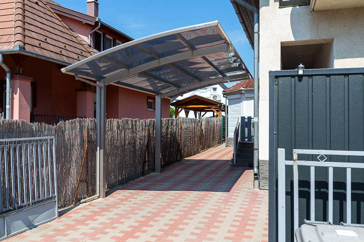 Ügyfelünk balatoni nyaralója térkövezett udvarán, a ház és a kerítés közötti keskeny sávban kellett elhelyeznünk a kocsibeállót. A kapu elhelyezése miatt a beálló pontos helye adott volt, így különösen fontos volt olyan méret választása, amely optimálisan kihasználja a rendelkezésre álló teret. A Ximax Portoforte 60 szimpla kocsibeálló 555 cm-es hosszával és 270 cm-es szélességével tökéletesen illeszkedett a helyhez, mintha éppen oda tervezték volna. A rozsdamentes acél színű szerkezet nemcsak védelmet nyújt a járműnek, hanem szerencsés módon a házba vezető lépcsőt és a bejárat előtti részt is lefedi, így esős időben kényelmes, száraz bejáratot is biztosít az otthonba.