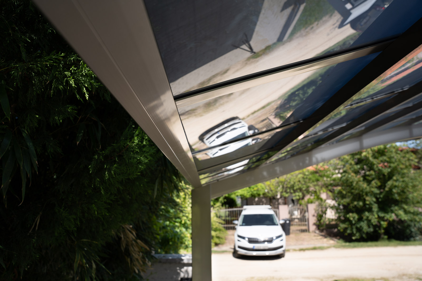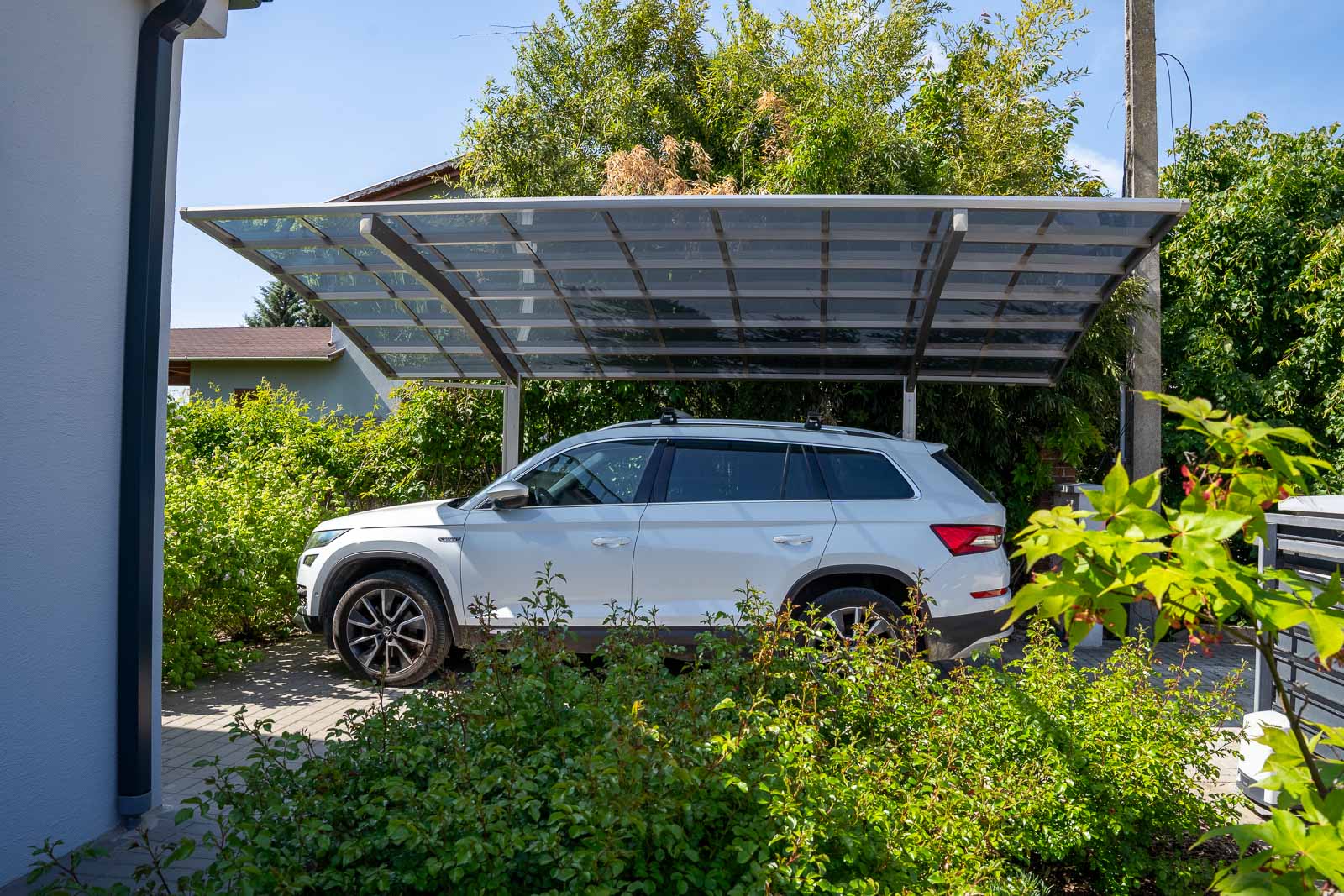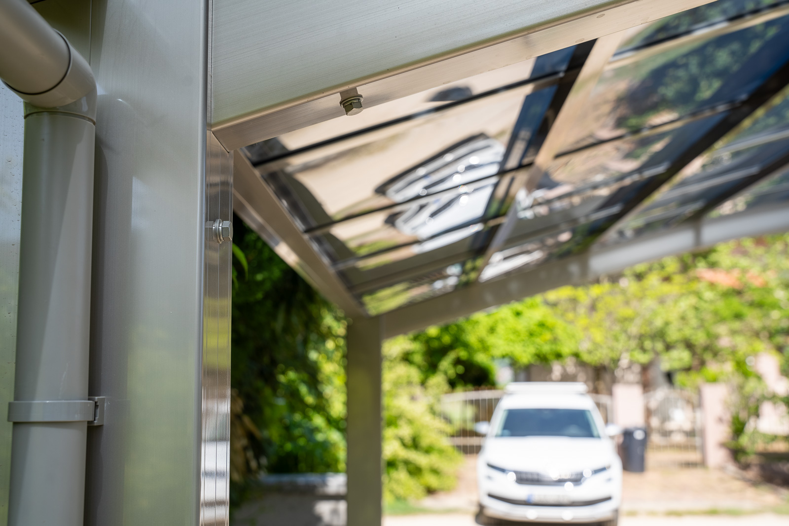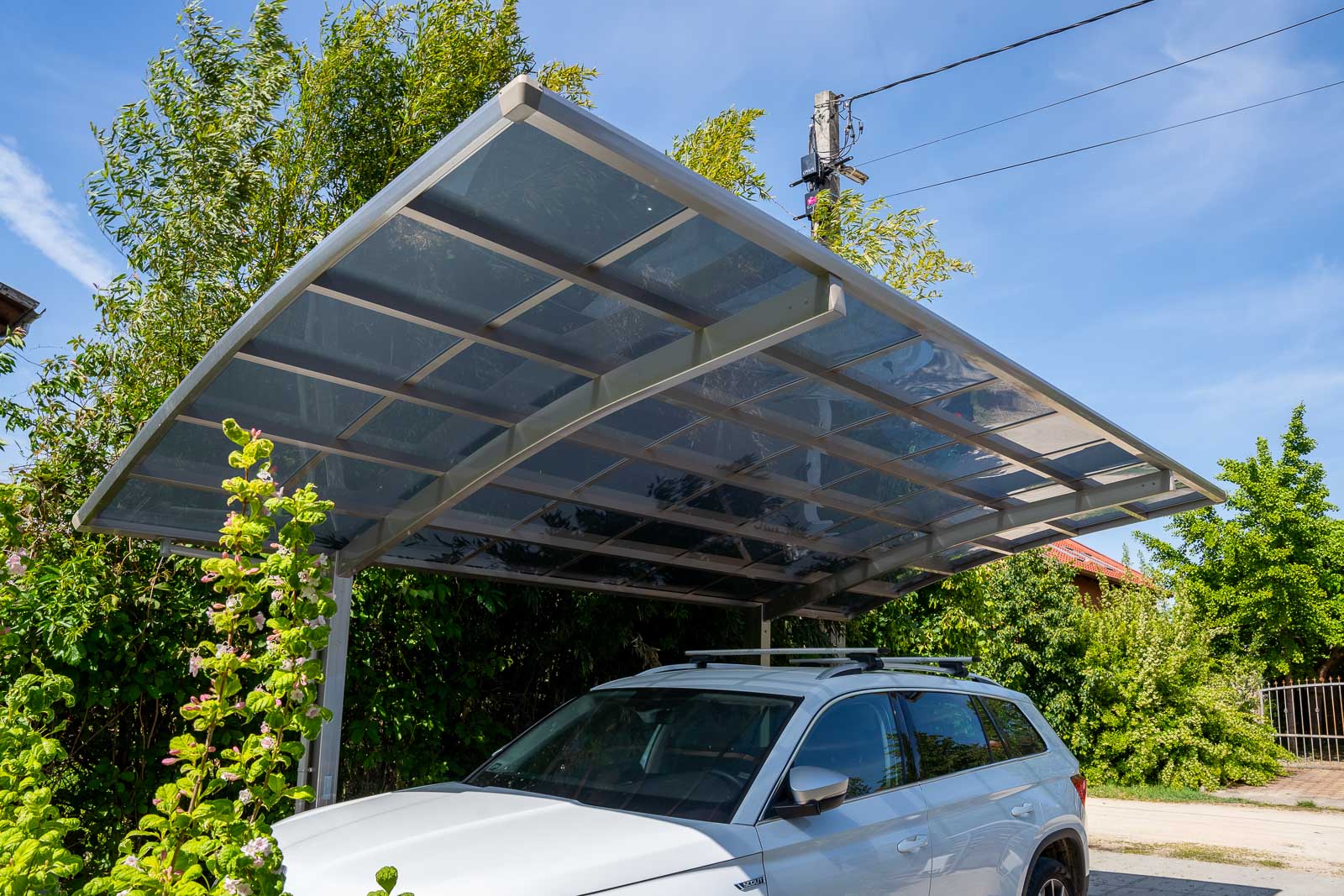A Portoforte autóbeálló sorozat dizájnja tökéletes harmóniát teremt bármilyen környezetben. Modern és praktikus kialakításával kiemelkedik a többi autóbeálló gyártók modelljei közül, miközben az időtálló elegancia jegyében készült a legmagasabb minőségű anyagok felhasználásával. Az eloxált alumínium és polikarbonát kombinációja erőt és rugalmasságot ad a szerkezetnek, így garantálva a tartósságot és a modern dizájnt. A tető hőálló polikarbonátból készült, füstszürke színben, teljes körű védelmet nyújtva az UV-sugárzás és az infravörös sugárzás ellen. A polikarbonát rendkívül stabil, közel 250-szer ellenállóbb az üvegnél. Az ereszcsatorna lefolyócsővel van ellátva.