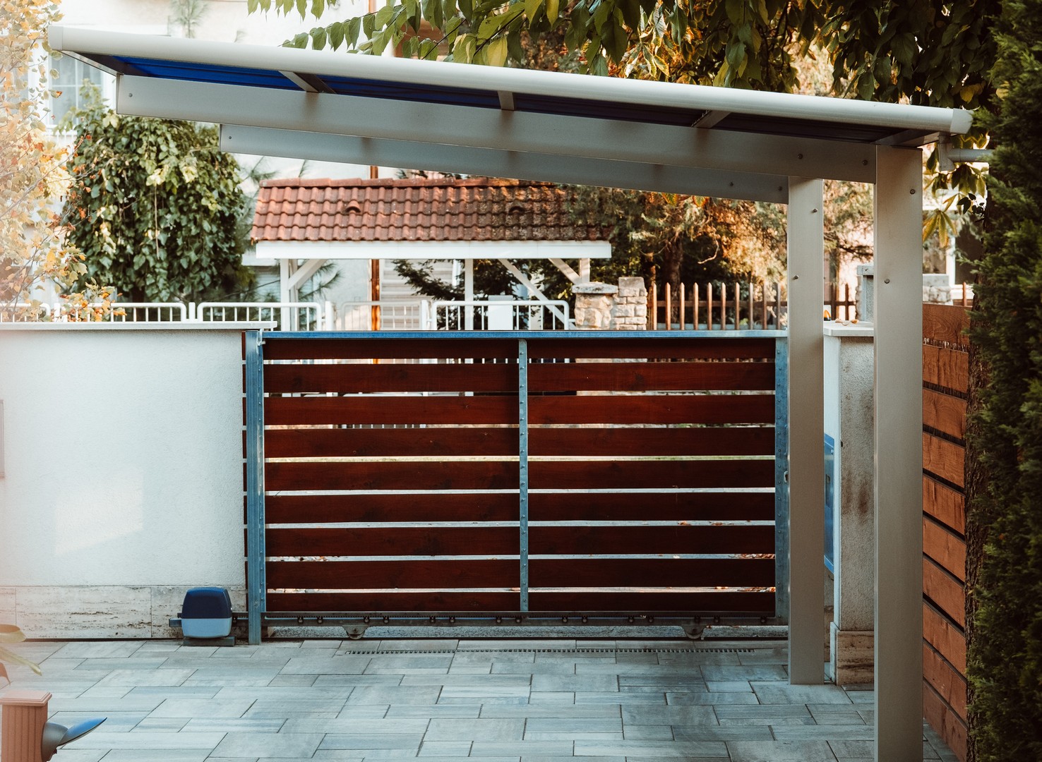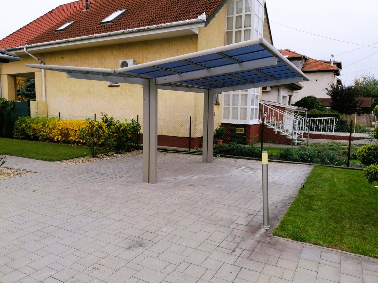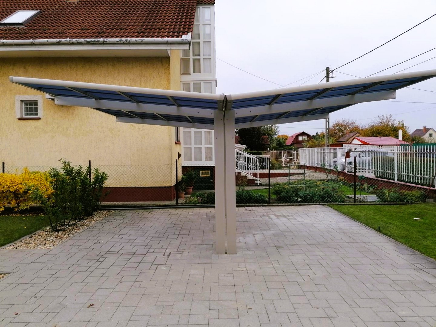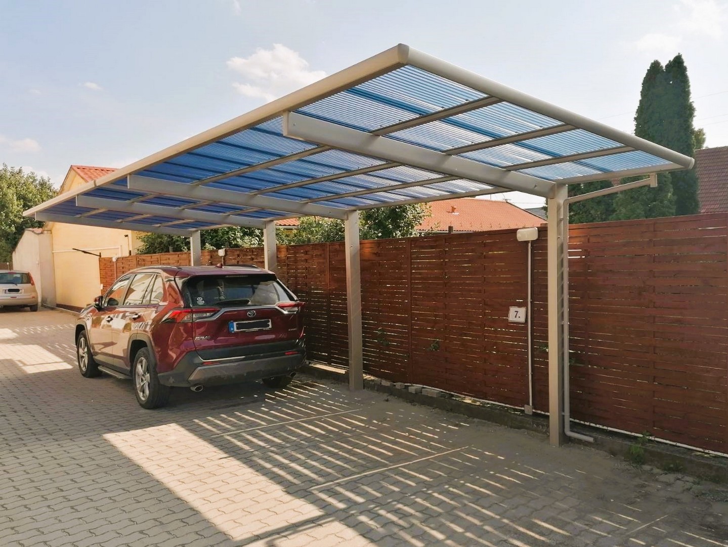 A tető 2 oszlopon nyugszik, melyek egy oldalra rendezettek és beton alapba kerülnek rögzítésre. A tető fedése hullámos, füst színű polikarbonát, mely 100%-osan visszaveri az UV sugarakat és 37 / 50%-ban pedig szűri az infravörös fény tartományt is. A XIMAX autóbeállók saját vízelvezető rendszerrel rendelkeznek.