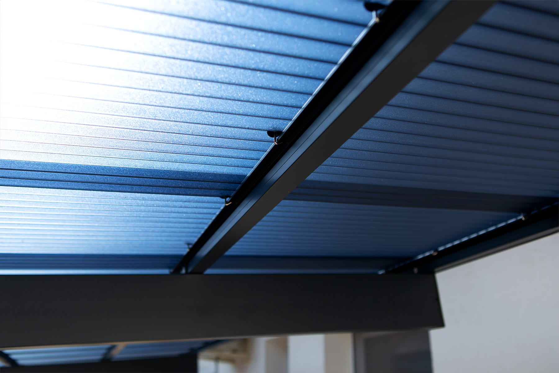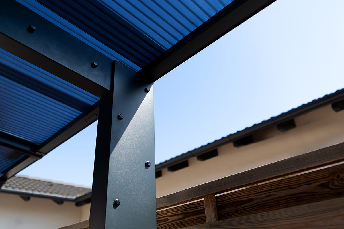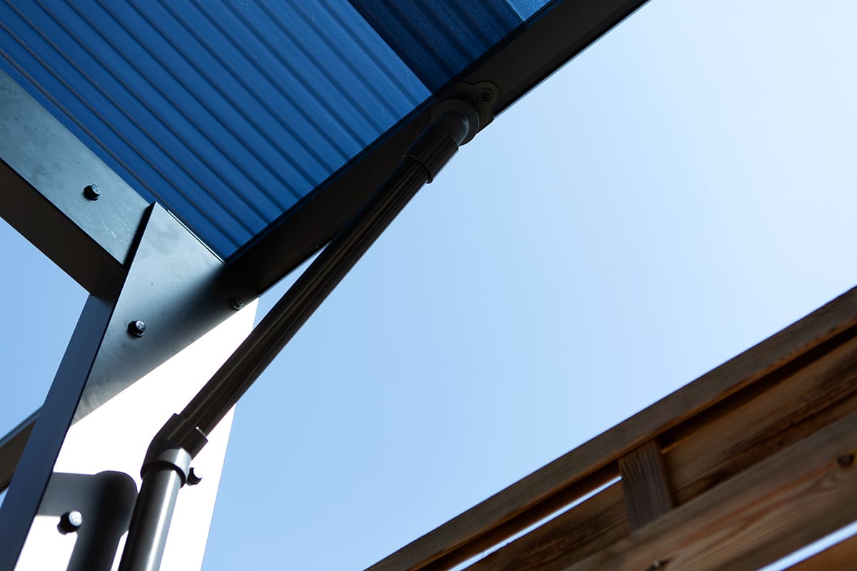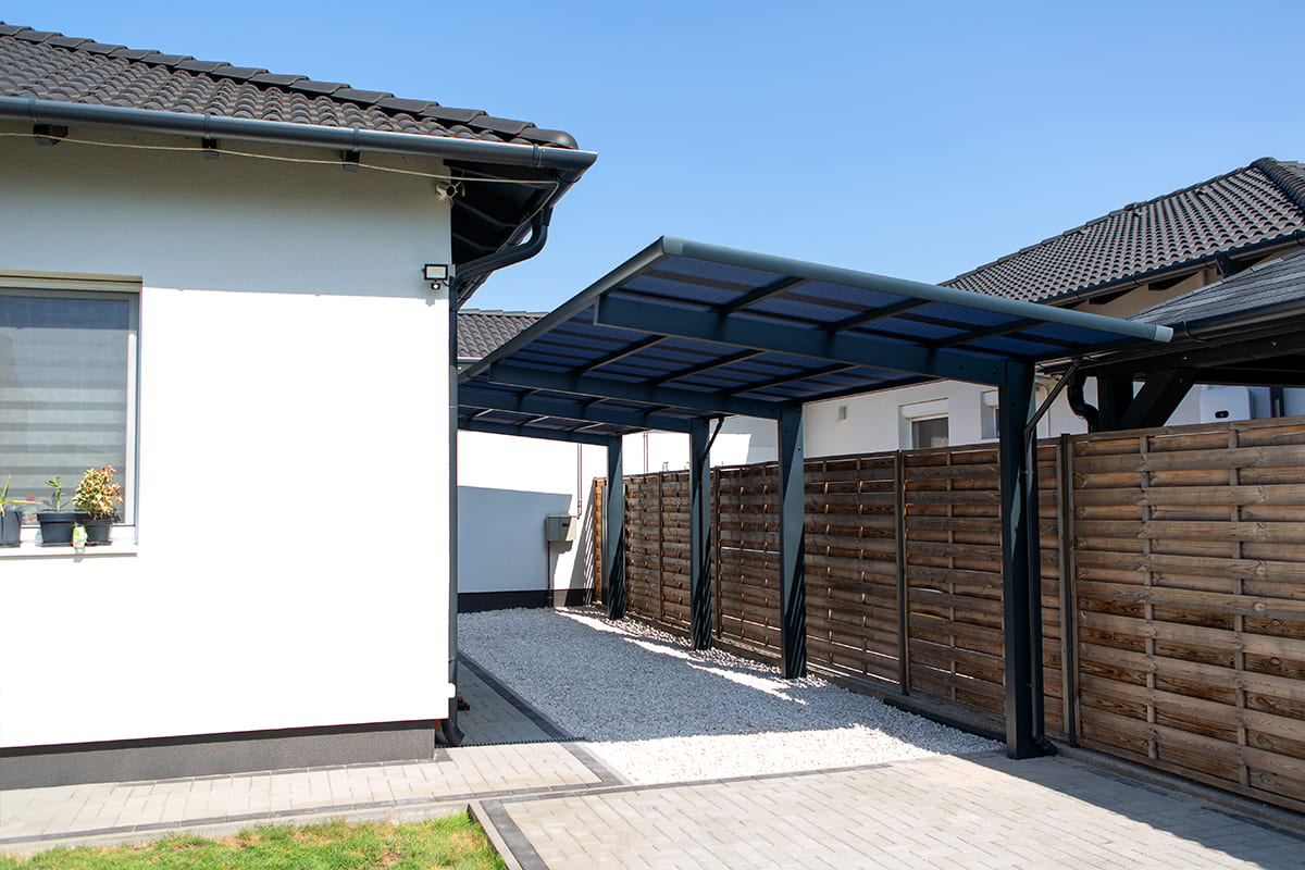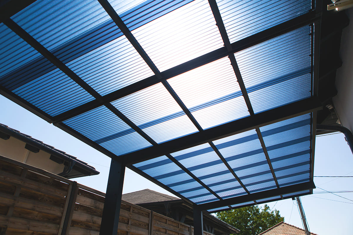 A kocsibeálló tetőszerkezete egyenes vonalú, füstös-kék hullámos polikarbonát fedést kapott. Ez a modern tetőfedés nemcsak esztétikus, hanem rendkívül funkcionális is. Az UV-védelemmel ellátott polikarbonát fedés megakadályozza, hogy a nap káros sugarai elérjék autóit, így védve azok fényezését és belső terét a fakulástól és az UV-sugárzás káros hatásaitól. Emellett a füstös-kék fedés átereszti a természetes fényt, így a tér világos és szellős marad, mégis megőrzi az autók biztonságát.