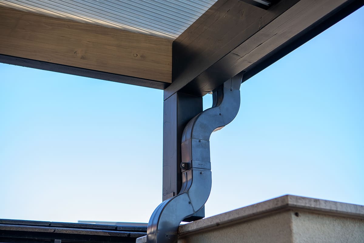 A vízelvezetés egyedileg épített négyzetes csatornával lett megoldva, szintén az eddigi megjelenéshez passzoló antracit színben. Az ereszcsatorna összegyűjti az enyhén lejtős tetőről a csapadékvizet és az egyik oldalláb mentén a talajon kerül kivezetésre, így biztosak lehetünk benne, hogy az esővíz nem pang a beálló területén illetve nem folyik le körbe a tető oldaláról.