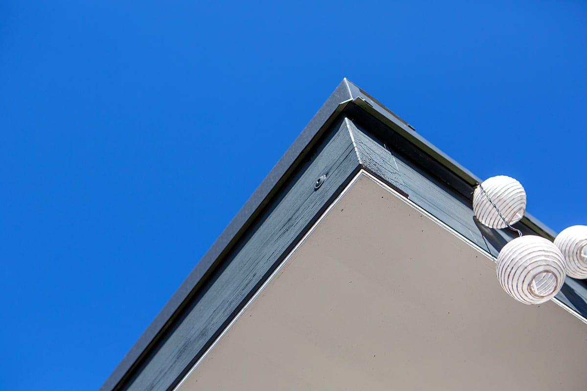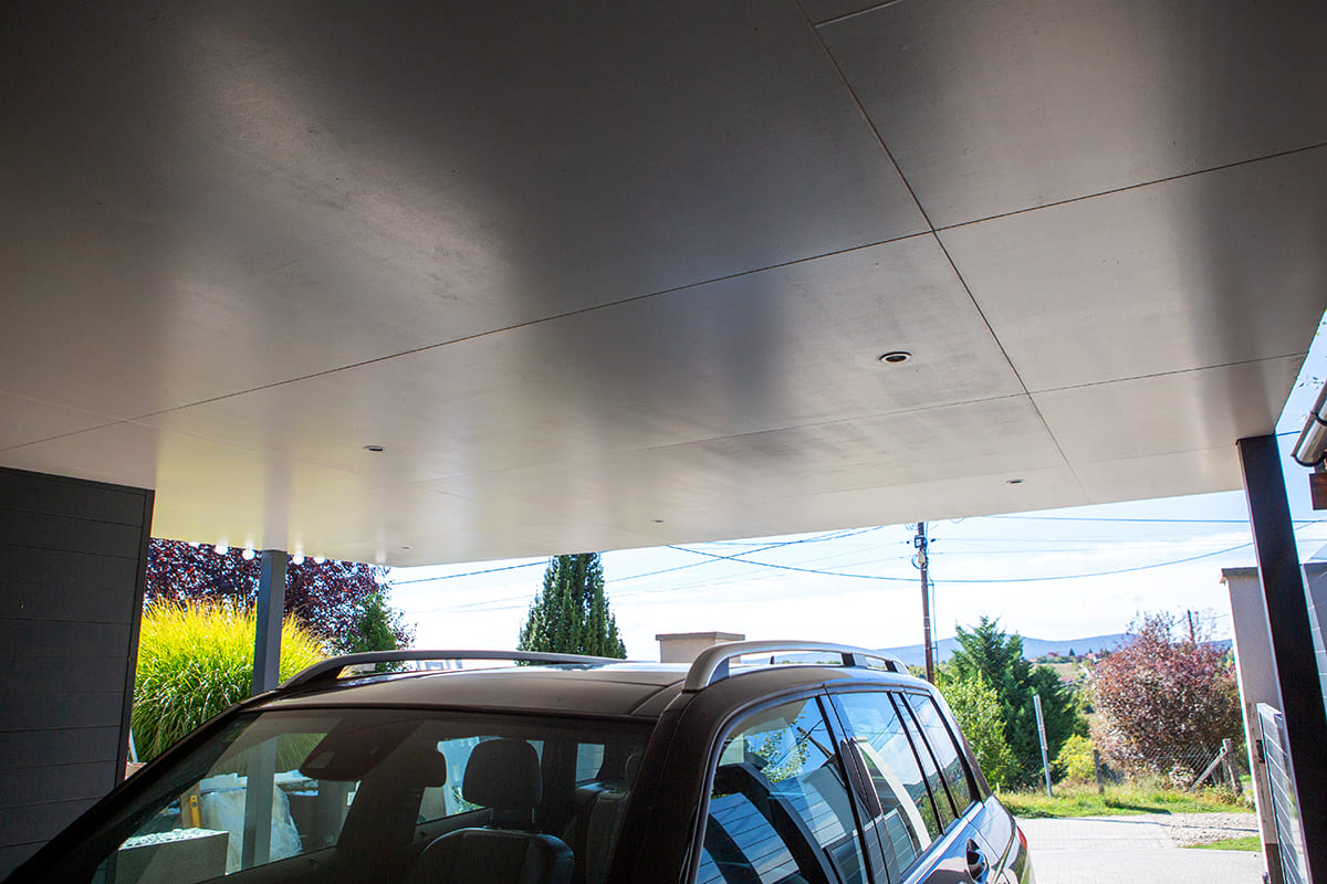A kocsibeálló fedésére trapézlemezt használtunk, amely több rétegű gyári felületvédelemmel ellátott acéllemez. A trapézlemez alsó oldala gyárilag tört fehér színű, ami azonban itt nem látszik, mivel a mennyezetet fehér rétegelt falapokkal burkoltuk. Ez a megoldás nemcsak esztétikus, hanem a szigetelést is javítja, valamint egységes, letisztult megjelenést kölcsönöz az építménynek.