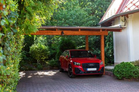 A képen látható autóbeálló szerkezete ragasztott fából készült. A fedést trapéz lemez alkotja, amely nemcsak esztétikailag vonzó, hanem tartós és időjárásálló is.