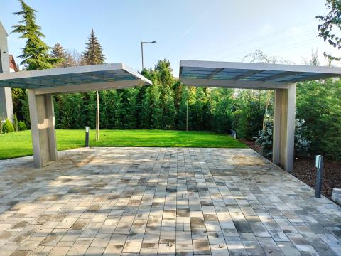 Dupla, ragasztott fa szerkezetű kocsibeállót építettünk, térkövezéssel, aranytölgy hatású szendvicspanel fronttal, oldalzárással és Hörmann garázskapuval.