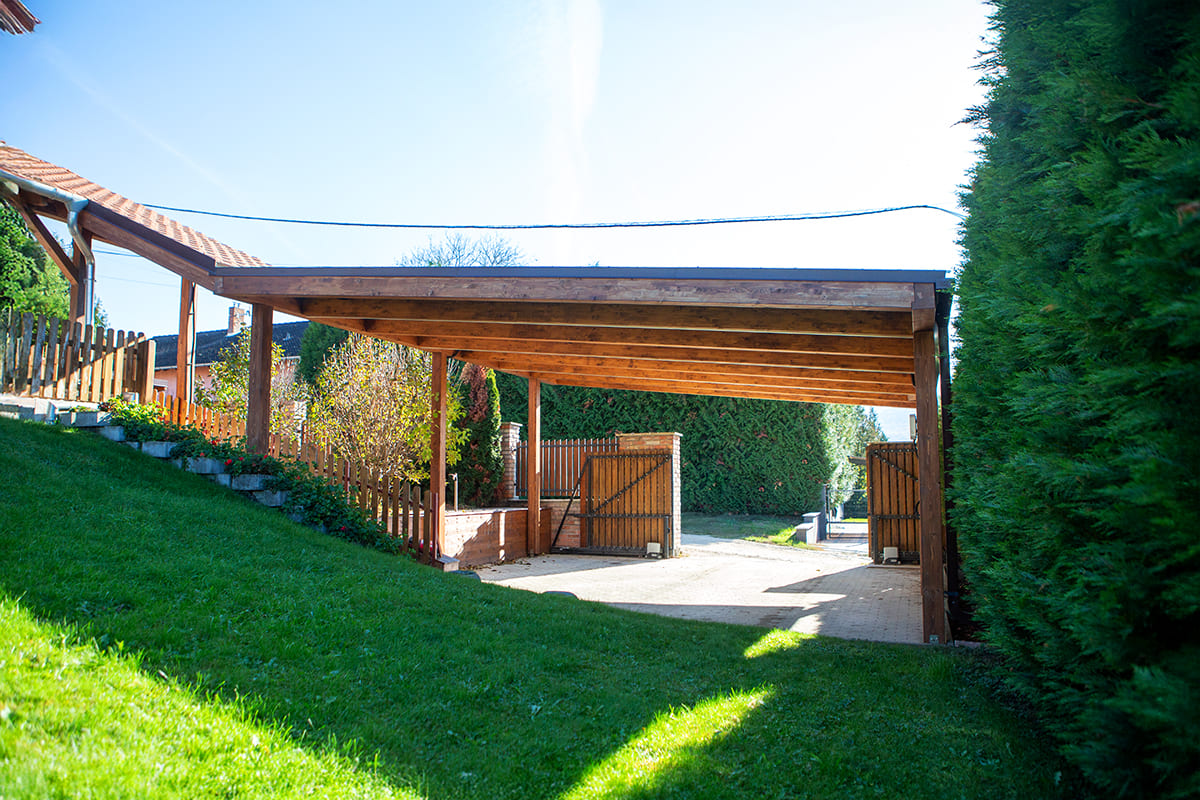 A családi ház tégla és fa anyagaihoz igazodva a kocsibeálló szerkezetét is úgy alakítottuk ki, hogy az organikusan beleolvadjon a környezetbe. A ragasztott fa alapanyagból készült szerkezetet lazúrral kezeltük, hogy a természetes erezet látható maradjon, ugyanakkor az időjárásnak is ellenálljon. A tervezési folyamat során külön hangsúlyt fektettünk arra, hogy a beálló a házzal összekötő lépcsősor fölé is kiterjeszthető legyen. Ennek köszönhetően a kocsibeálló nemcsak a járművek védelmét szolgálja, hanem az eső, hó vagy napsütés elleni védelem érdekében a ház megközelítését is kényelmesebbé teszi.