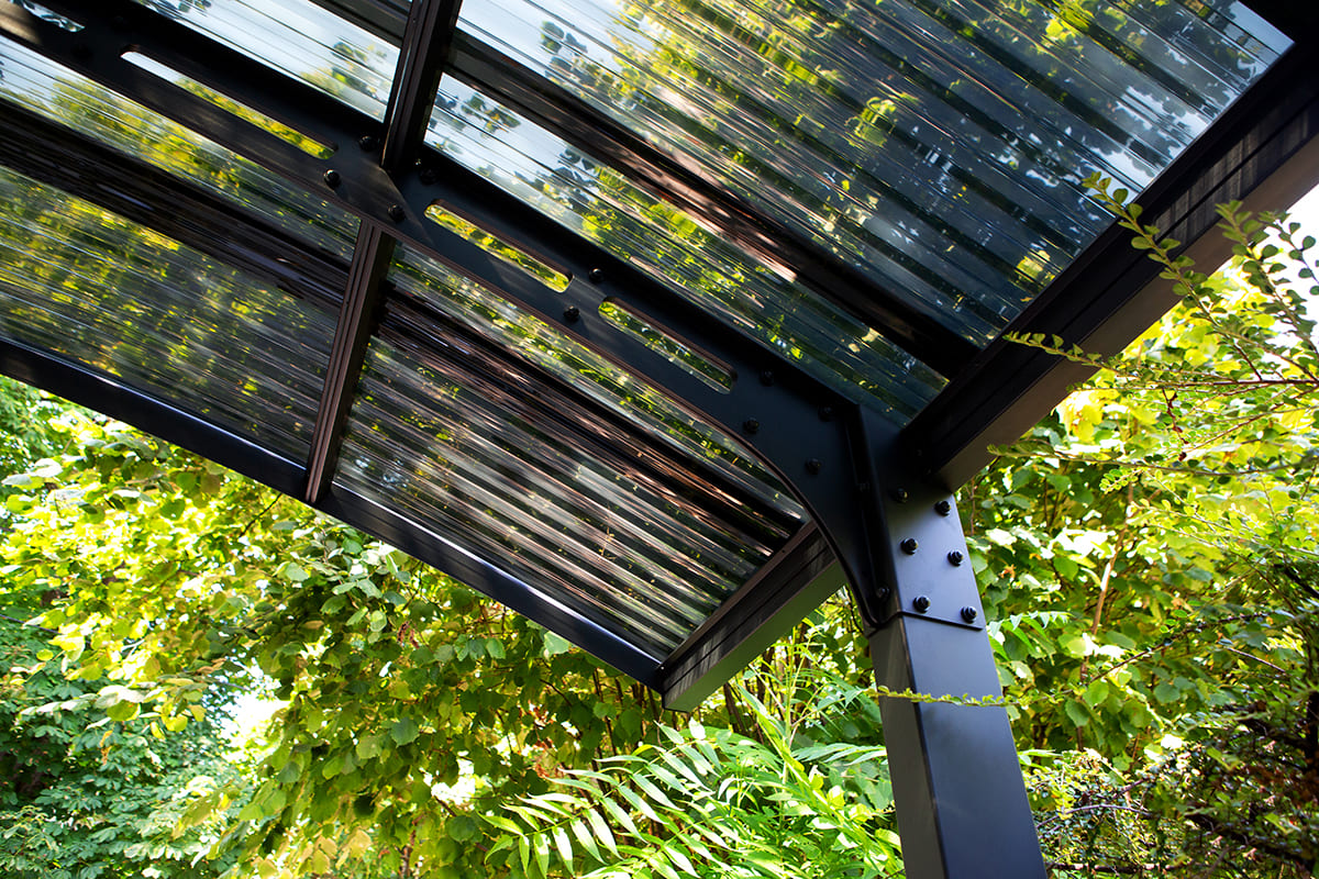 A Palram Arizona egyik legnagyobb előnye a fényáteresztő, UV-védett polikarbonát fedés, amely kétféle változatban elérhető: hullámos (wave) és tömör (breeze) panelek formájában. Az ügyfél által választott hullámos füstszürke polikarbonát tetőpanel esztétikus megjelenést biztosít, miközben 100%-ban védi a járművet a káros UV sugárzástól. Ez a tetőpanel nemcsak az autó festésének védelmében játszik kulcsszerepet, hanem lehetővé teszi, hogy természetes fény jusson be, anélkül, hogy a kocsibeálló túlságosan felmelegedne.