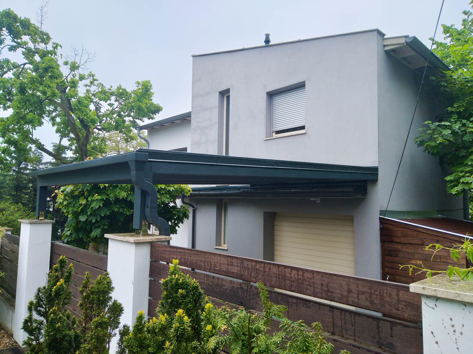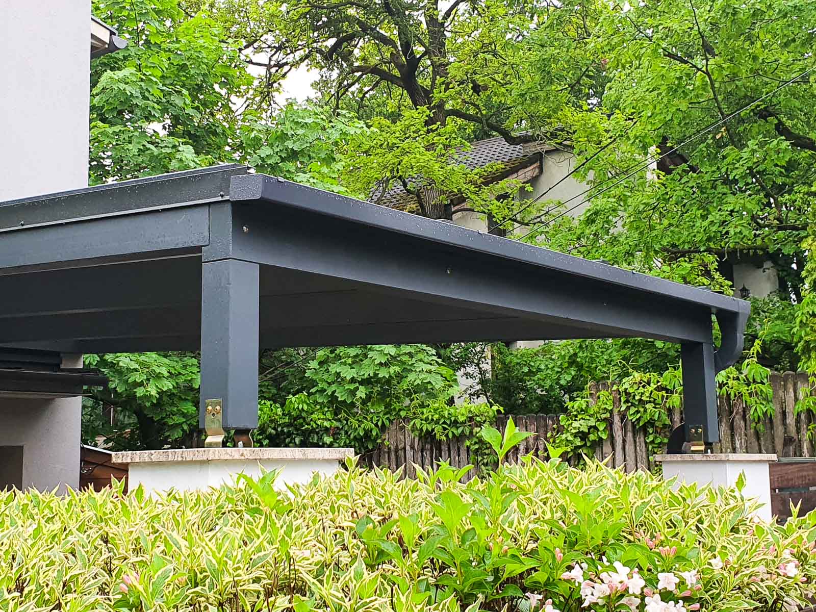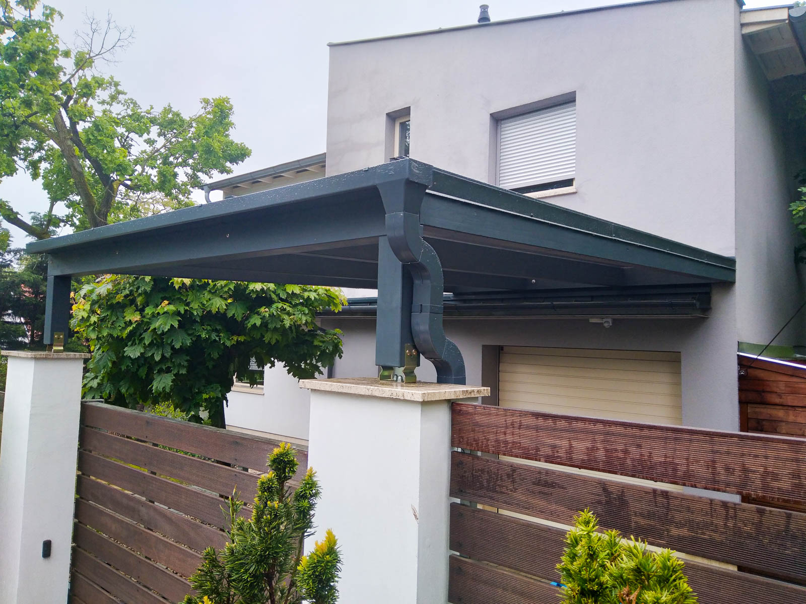 A kocsibeálló tartószerkezete ragasztott fából készült, ami biztosítja a hosszú élettartamot és a stabilitást, miközben költséghatékony megoldás is. Az antracit színvilág modern megjelenést kölcsönöz, amely jelenleg rendkívül népszerű az építészetben, mivel az újépítésű házak egyik jellemző színe. A ház falára rögzített féltető hatékony helykihasználást biztosít, emellett a kocsibeálló megjelenésében a ház részévé válik.