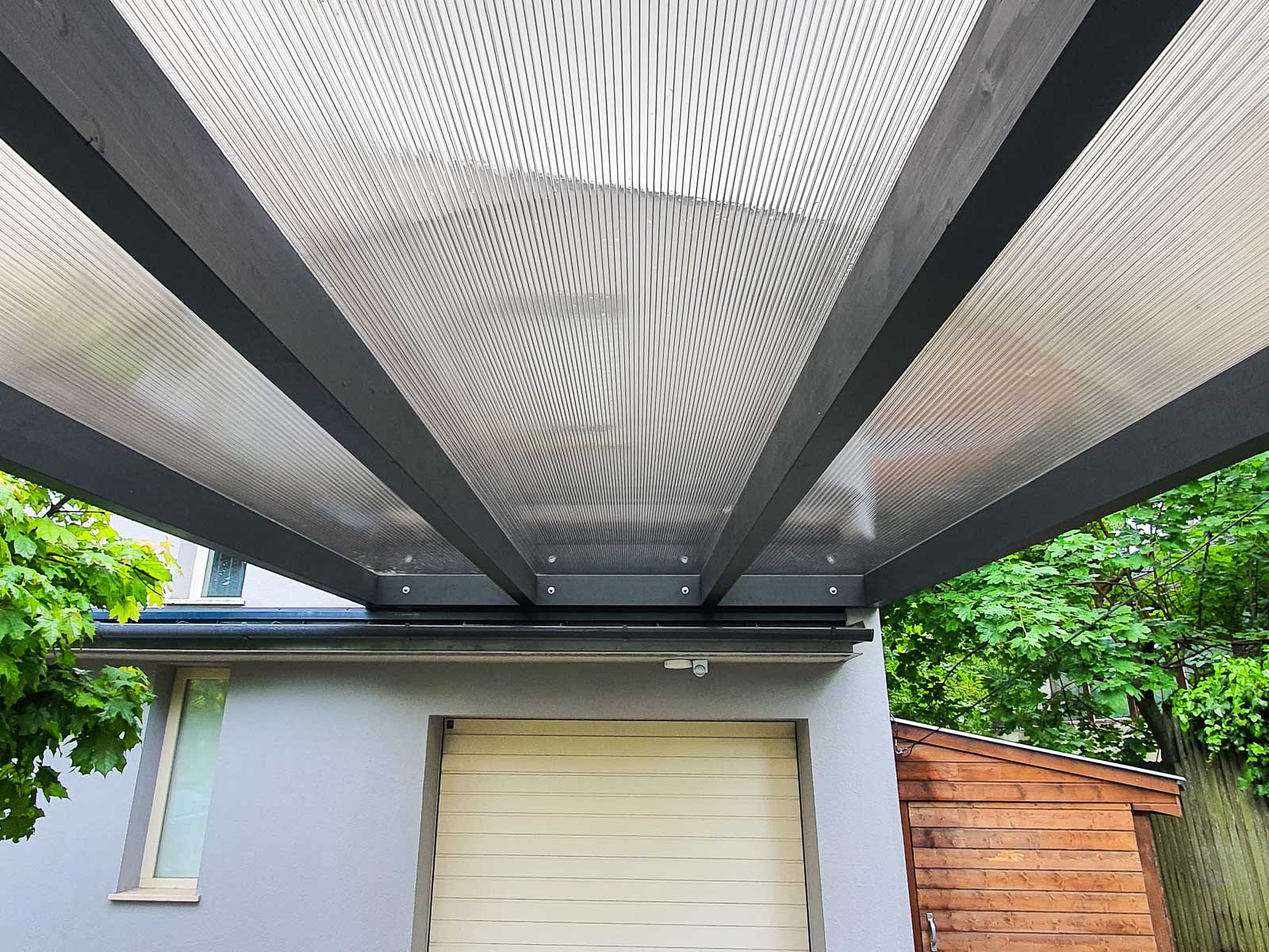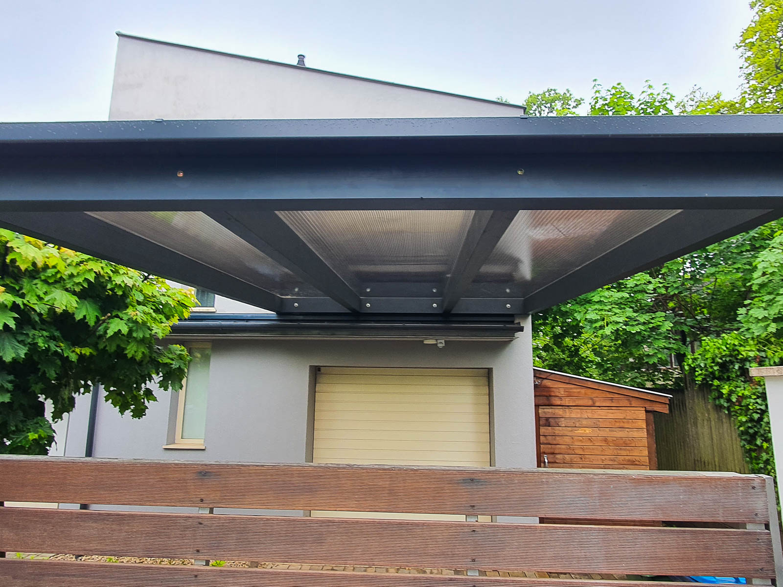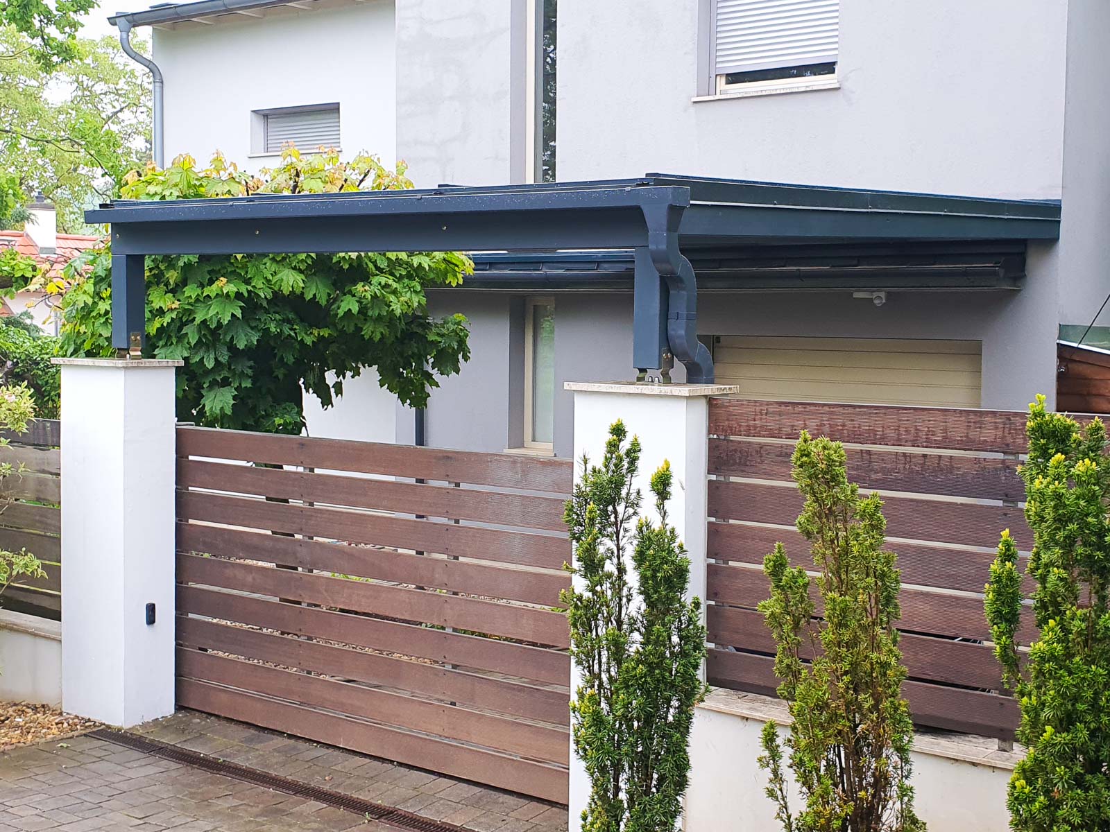 A kocsibeálló tartószerkezete ragasztott fából készült, ami biztosítja a hosszú élettartamot és a stabilitást, miközben költséghatékony megoldás is. Az antracit színvilág modern megjelenést kölcsönöz, amely jelenleg rendkívül népszerű az építészetben, mivel az újépítésű házak egyik jellemző színe. A ház falára rögzített féltető hatékony helykihasználást biztosít, emellett a kocsibeálló megjelenésében a ház részévé válik.