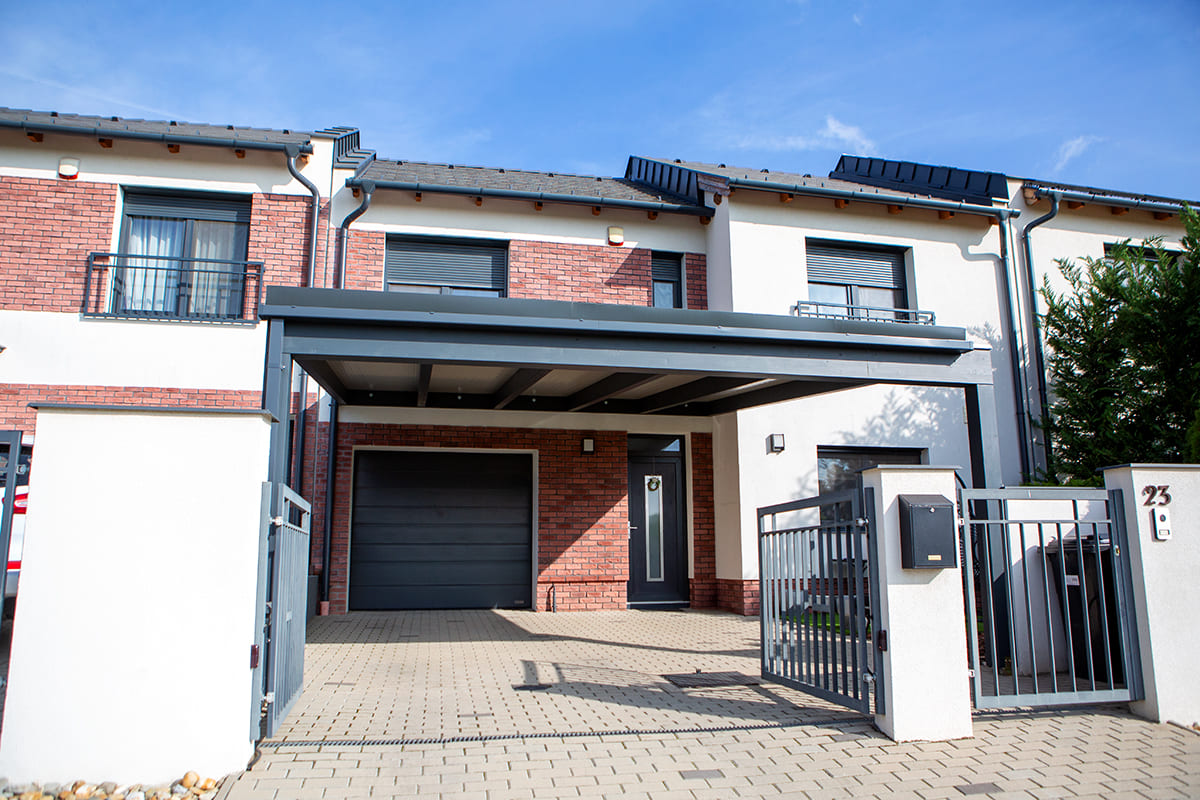 Egy nyugodt, kertvárosi övezetben fekvő sorházhoz építettük ezt a szendvicspanel fedésű kocsibeállót. A vázat rétegragasztott fából terveztük és építettük meg. A színválasztásnál ügyeltünk a már meglévő színekkel való harmóniára és hogy a kocsibeálló jól illeszkedjen a környezetébe. Az ügyfél egy letisztult stílusú, egyszerű és igényes, tartós kocsibeállót szeretett volna, ami a már meglévő zárt garázs előtt helyezkedik el. Így autója akkor is biztonságban és védve van, ha nem a zárt garázsban áll. Ez a megoldás sokszor gyors és praktikus a rohanós hétköznapokban, amikor nem kell, akár naponta több alkalommal is, ki- és beállni az ajtóval ellátott zárt garázsba. A praktikumon túl ez a megoldás igen esztétikus is, tökéletesen illeszkedve a házhoz. Az építmény kitölti az eddig üresen álló teret és a fa anyagnak köszönhetően még otthonosabb az összkép.