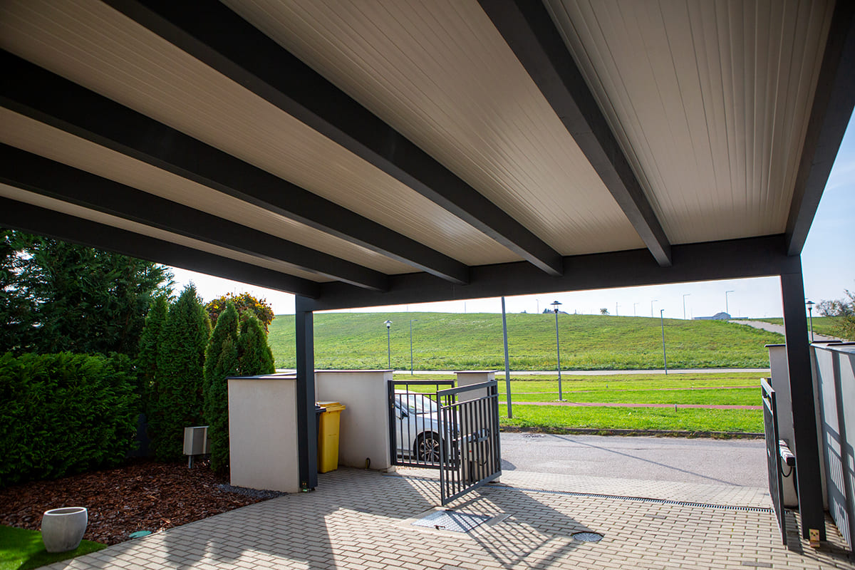 A szendvicspanel időtállóságának és sokoldalúságának köszönhetően egyre népszerűbb alapanyag az építőiparban, legyen szó oldalfedésekről, új épületek építéséről, vagy mint ahogy ebben a szendvicspanel fedésű kocsibeálló esetében is, parkolóhelyek fedéséről.
