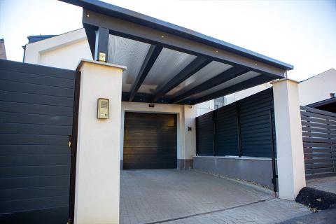 Letisztult stílusú, egyedi igények alapján készült, nyitott, szendvicspanel fedésű kocsibeálló, antracit színű rétegragasztott fa szerkezettel.