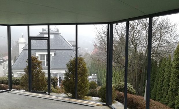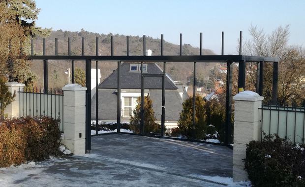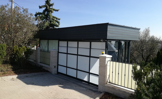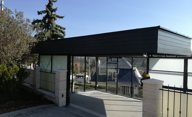 Egyedi designnal készült, üveg oldalú kocsibeálló. A szerkezet vasból készült, a fedés korcolt lemez. A tető elegáns dobozolást kapott, ami elrejti a lejtést.