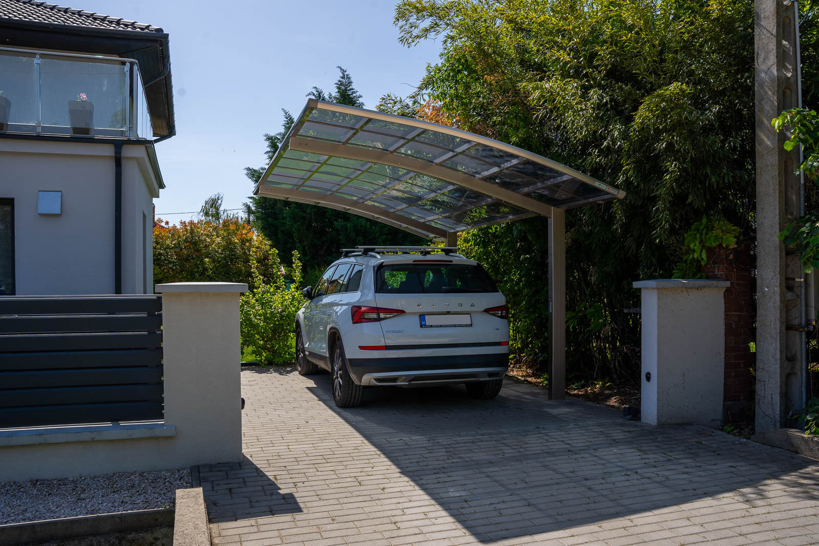 A Portoforte autóbeálló sorozat dizájnja tökéletes harmóniát teremt bármilyen környezetben. Modern és praktikus kialakításával kiemelkedik a többi autóbeálló gyártók modelljei közül, miközben az időtálló elegancia jegyében készült a legmagasabb minőségű anyagok felhasználásával. Az eloxált alumínium és polikarbonát kombinációja erőt és rugalmasságot ad a szerkezetnek, így garantálva a tartósságot és a modern dizájnt. A tető hőálló polikarbonátból készült, füstszürke színben, teljes körű védelmet nyújtva az UV-sugárzás és az infravörös sugárzás ellen. A polikarbonát rendkívül stabil, közel 250-szer ellenállóbb az üvegnél. Az ereszcsatorna lefolyócsővel van ellátva.