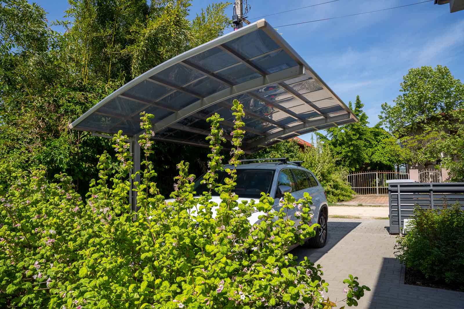 A Ximax autóbeálló nem csupán védi gépjárművét a környezeti hatásoktól, hanem vonzza is a járókelők tekintetét. Az innovatív, kétoszlopos kialakításnak köszönhetően a szerkezetek maximálisan rugalmasak és könnyűek. Számos színváltozatban elérhetőek, a képeken látható modell 5550 mm x 3010 mm. Keresse fel cégünket, hogy megtalálja az Ön igényeinek megfelelő autóbeállót.