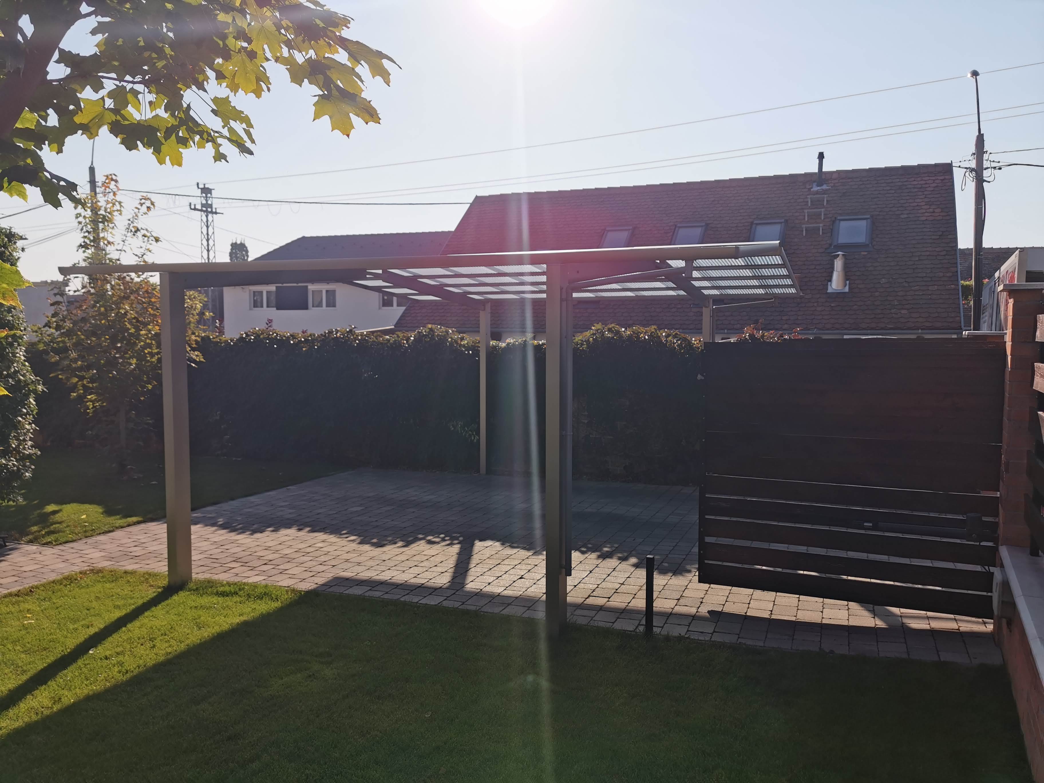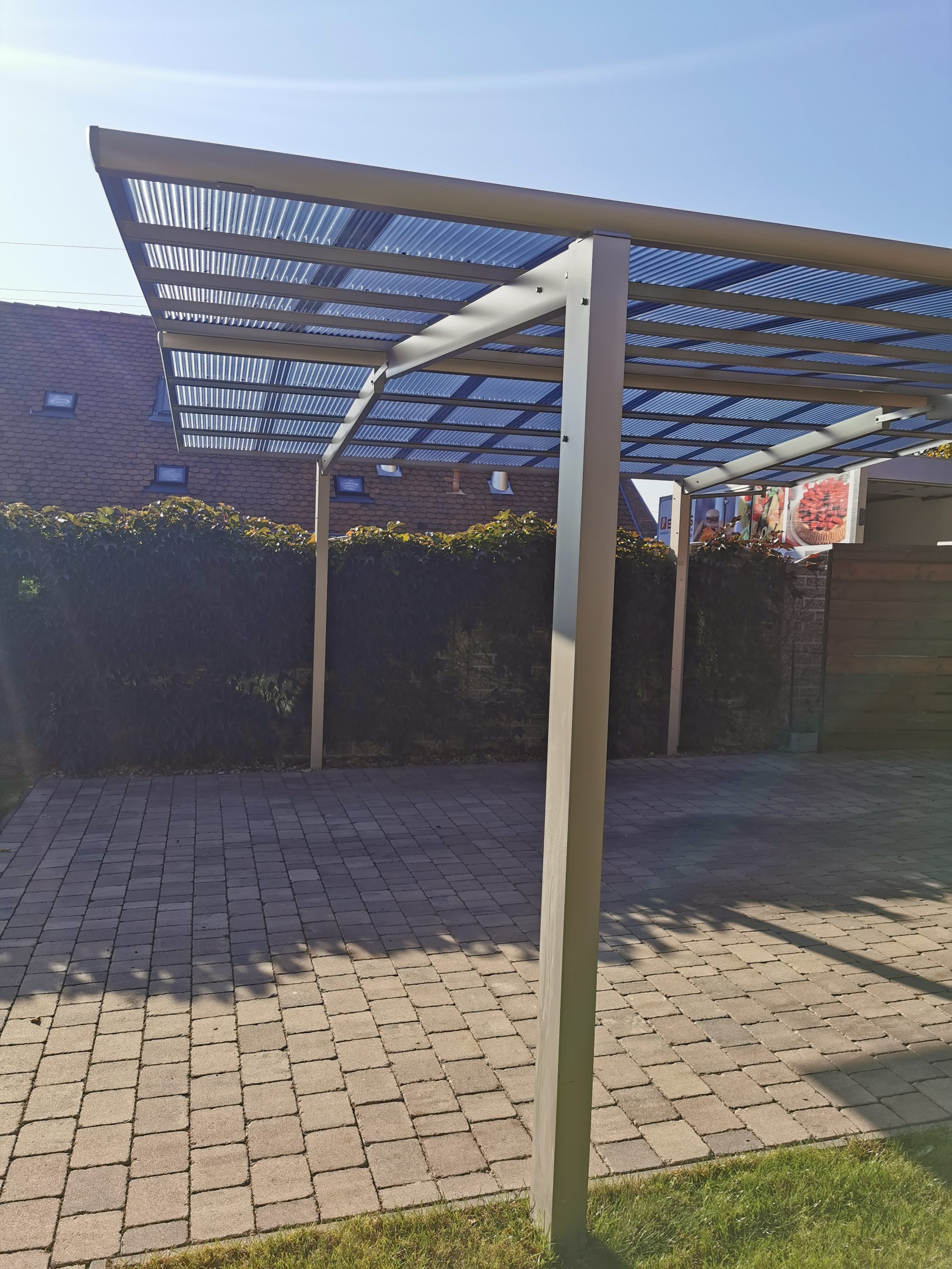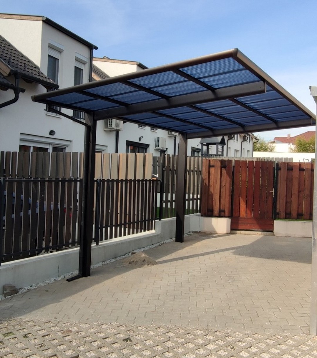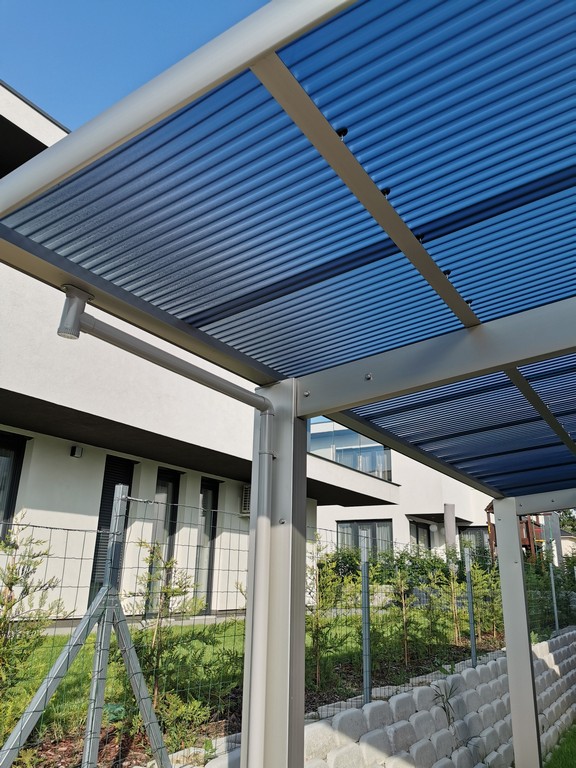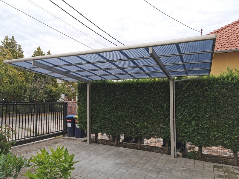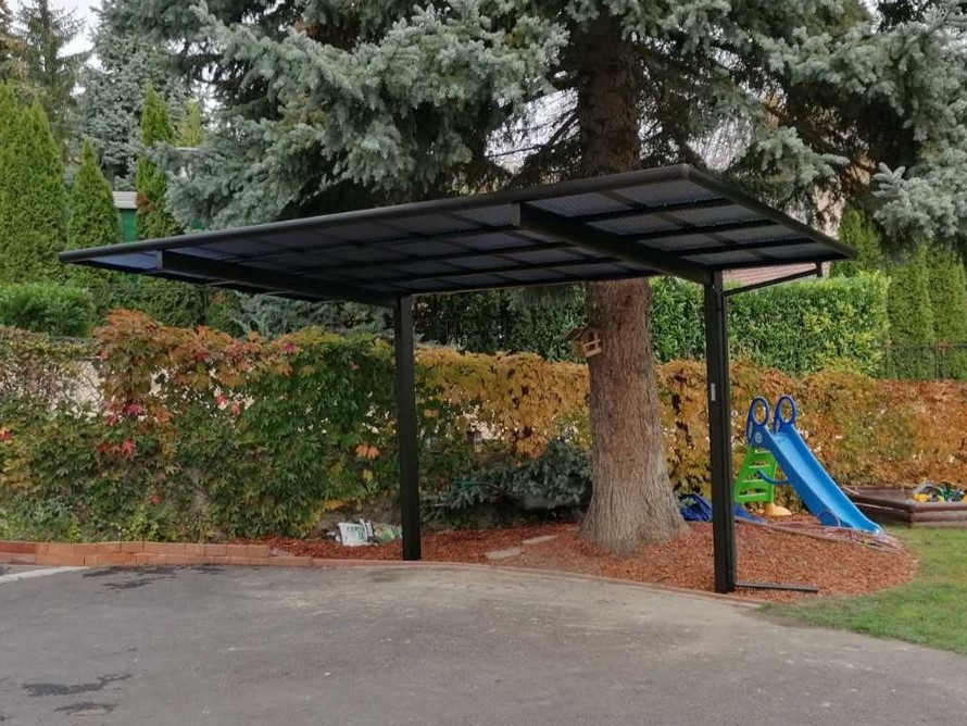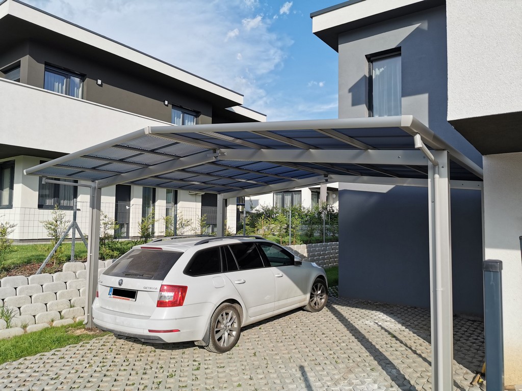 A tető 2 oszlopon nyugszik, melyek egy oldalra rendezettek és beton alapba kerülnek rögzítésre. A tető fedése hullámos, füst színű polikarbonát, mely 100%-osan visszaveri az UV sugarakat és 37 / 50%-ban pedig szűri az infravörös fény tartományt is. A XIMAX autóbeállók saját vízelvezető rendszerrel rendelkeznek.