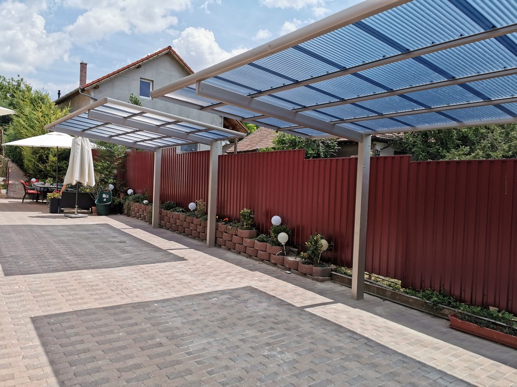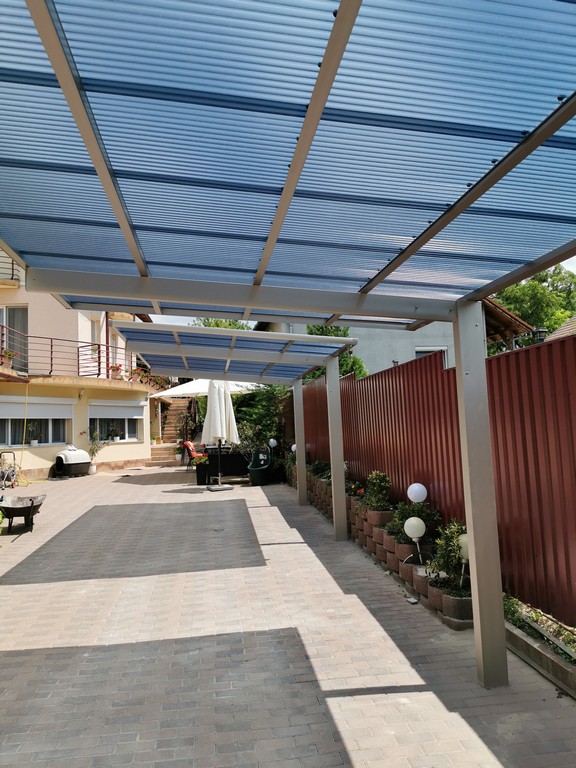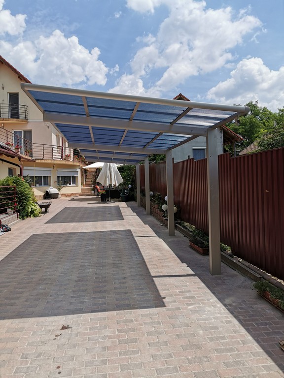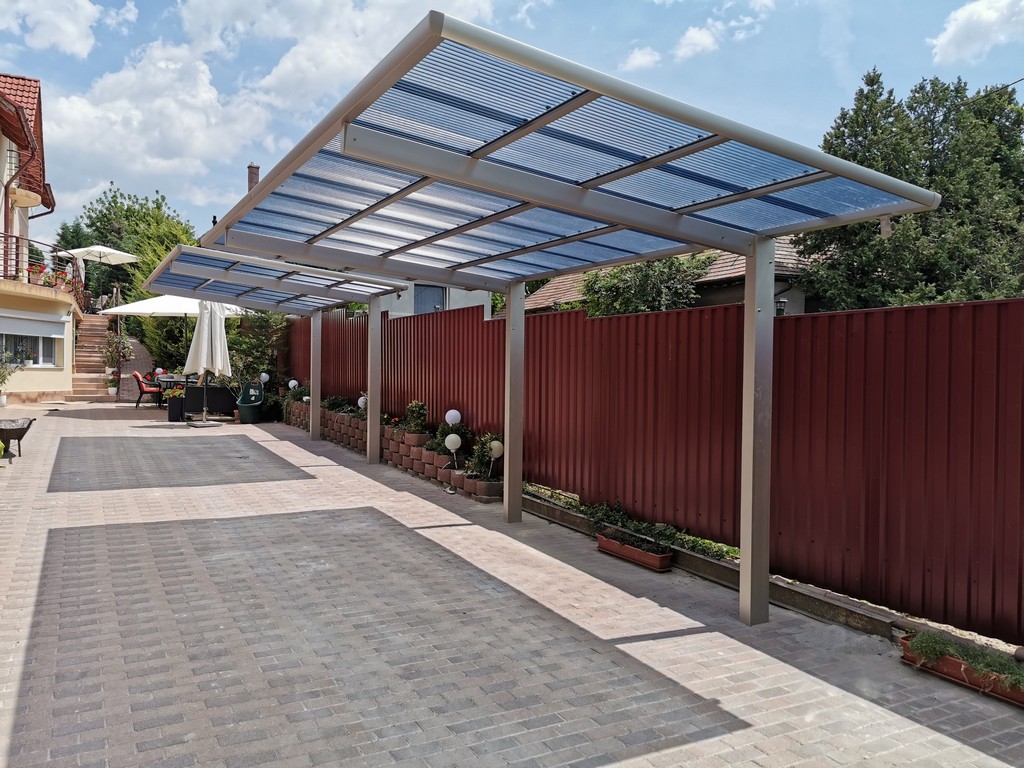 Ximax Swingline tandem elrendezesben, alumínium szerkezettel, "rozsdamentes acél" színben, polikarbonát fedéssel. Dupla kocsibeálló mérete kétszer 5,3m x 2,7m. Saját vízelvezető rendszerrel.